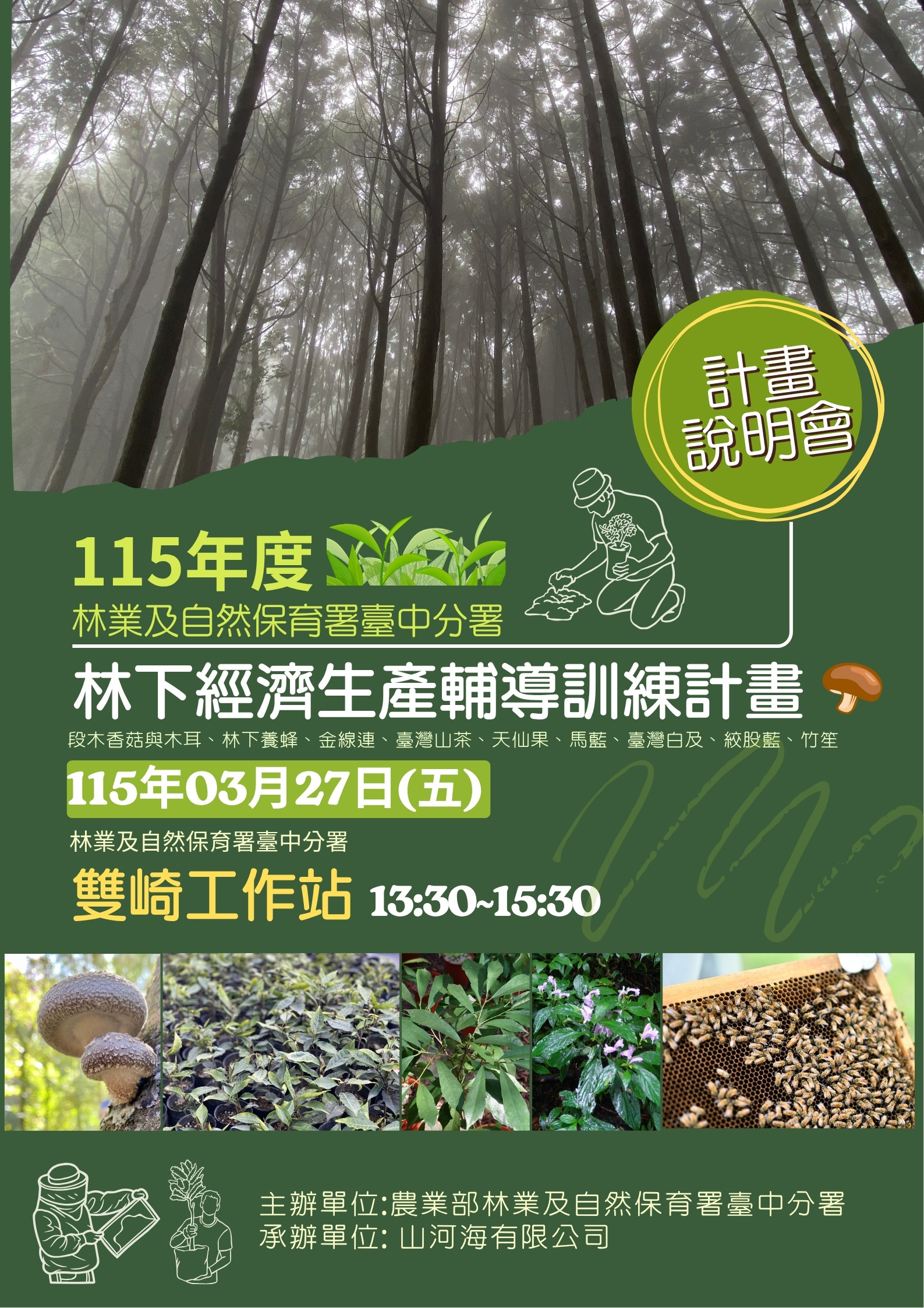 為提供林農多元森林經營選擇,兼顧森林保育與經濟收益,林業及自然保育署臺中分署將於3月27日(星期五)下午1時30分,在東勢區雙崎工作站(臺中市東勢區東關路6段1368號)舉辦「林下經濟生產輔導訓練計畫說明會」,本活動採自由入場,無需事先報名,歡迎轄內國有林承租人、周邊林農及社區部落踴躍參與,掌握林下經濟發展契機。