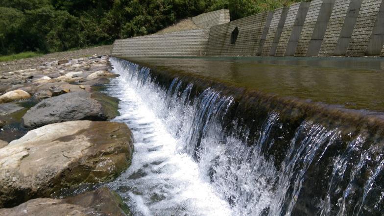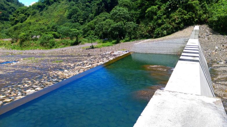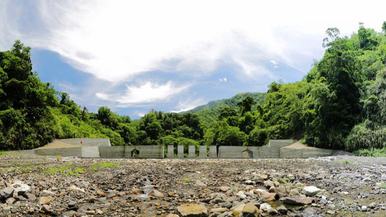 本工程採用梳子壩設計並增設防災通道開口兩處,汛期時因應不同洪水位,開口採用不同大小及高低設計而具有調節流量及滯洪功能,汛期後開口可作為清淤通道供大型機具越壩通行清理庫區,以利保持梳子壩攔砂功能延長使用年限。