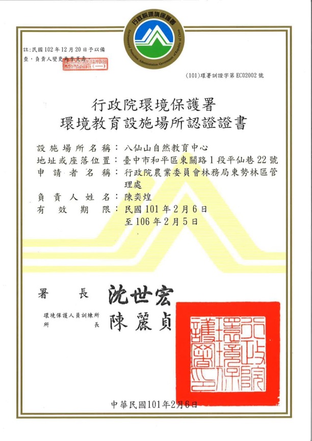 八仙山自然教育中心於101年2月6日成為林務局第一個獲環保署認證之「環境教育設施場所」,課程結合森林生態資源及林業特色。目前有10套戶外教學課程、8套主題活動、8套專業研習、4套特別企劃課程方案,讓孩子在森林環境中舒展身心、學習團結合作的精神,也能增加對萬物生命尊重的態度,體驗不同於課堂所學習的知識,達到「師法自然 快樂學習」的宗旨。