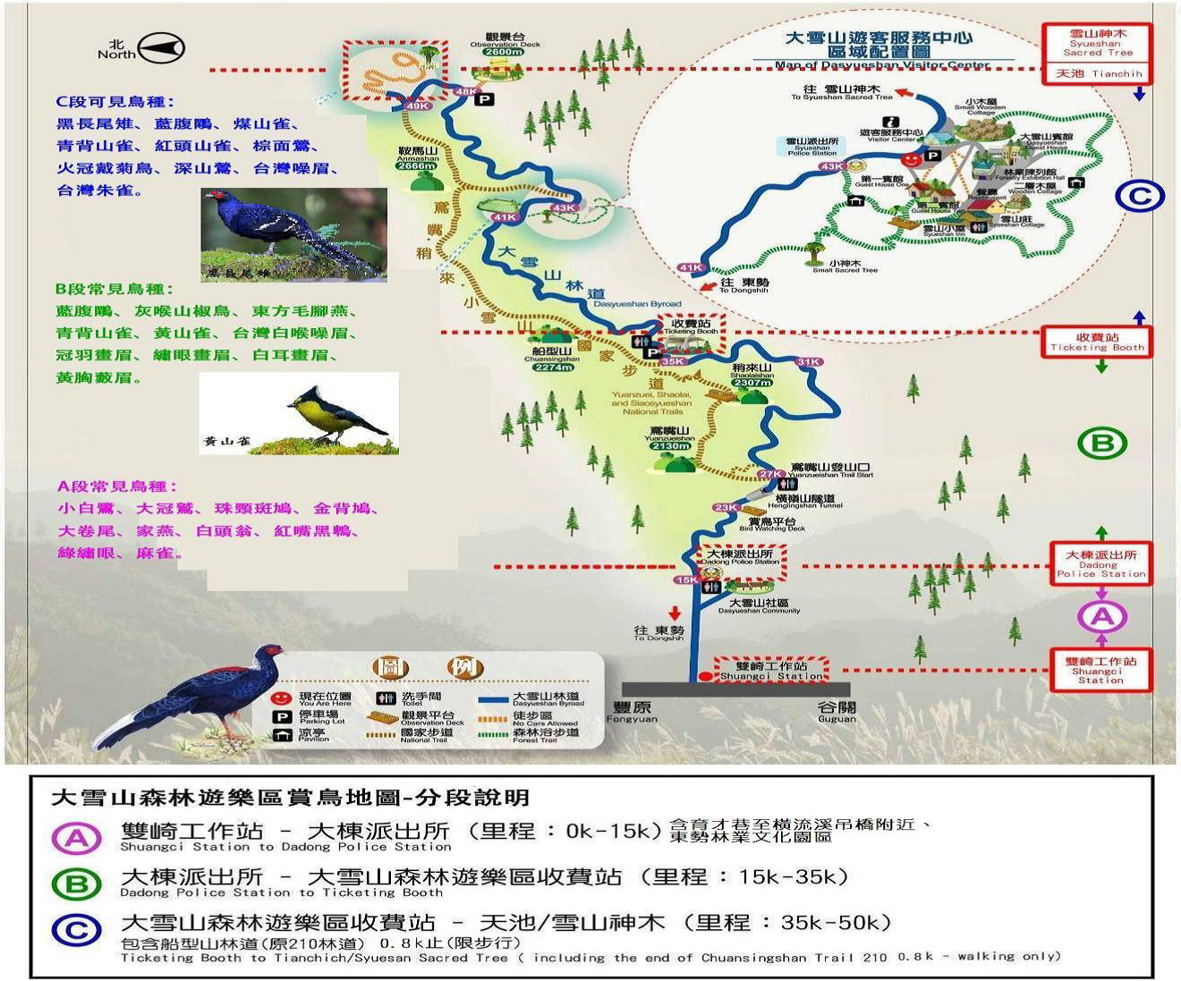全部展開 是否需要專業設備與知識,才能參加賞鳥比賽呢? 有無年齡限制? 賞鳥比賽中,需要鳥類辨識與分類的基礎知識,以及單、雙筒望眼鏡等設備,才能找到比較隱蔽的鳥類。而擁有專業的知識與技巧,才能在國內各地鳥會、大專院校社團及國外渡海而來的專業賞鳥高手中,脫穎而出,締造紀錄。 近年來也有不少初入門的賞鳥人士與愛好賞鳥的家庭,前來感受賞鳥大賽的氣氛與熱度,或是帶著小朋友來體驗大雪山國家森林遊樂區的優良環境,歷年賞鳥大賽參與者從8歲至75歲,只要您有興趣都歡迎參加。 大雪山賞鳥大賽是如何舉辦,怎麼樣分出勝負的呢? 比賽方式:每組至3至4人,在24小時內將所見、所聞的鳥類紀錄在比賽專用的eBird帳號內,採誠信原則,並由專業的評審確認資料的可信度,需要時也會要求參賽團隊提供佐證資料。 比賽時間:參賽日上午10時至隔日上午10時止,共24小時。 比賽範圍:東勢林業文化園區、大雪山國家森林遊樂區及聯外涵蓋大雪山林道0 K~50K處(含徒步區與森林浴步道、船型山林道0.8K止),可分為A、B、C 3段。(以下建議分段或有框框) A段:低海拔 0K-15K東勢林業文化園區-大棟派出所。 B段:中海拔15K-35K 大棟派出所-大雪山收費站。 C段:高海拔35K(收費站)-50K大雪山收費站-小雪山莊(天池)。 組別與獎項: 一般組:各地鳥會的專業高手、社會人士及大專學生等 ◎以鳥種數多寡決定名次,取前6名隊伍。 親子組:愛好賞鳥的家庭組成必需有國小3至6年級的小朋友參與,取前3名隊伍。 特別獎: ◎紀錄最多特有種鳥種隊伍。 ◎鳥種數大樂透(預測大會記錄鳥種數目,以最接近隊伍優勝)。 ◎新紀錄獎。 ◎最佳隊旗獎。 大雪山賞鳥大賽比賽所需時間為多久,有包含晚上嗎? 比賽進行時間為24小時,在晚上也是有持續進行的,一般來說比賽的流程如下(以該年度正式公布賽程規章為準): 活動時間 活動名稱 活動地點 08:00-09:30 報到 東勢林業文化園區 09:30-09:50 開幕式及規則說明 09:50-10:00 大合照 10:00- 比賽開始 次一日 10:15 比賽結束 10:30-11:30 成績結算 13:30-14:00 公布比賽成績及頒獎 大雪山國家森林遊樂區遊客中心 14:30 大賽結束 參加大雪山賞鳥比賽,需要注意那些事項? 賞鳥大賽活動限定於東勢林業文化園、大雪山國家森林遊樂區及聯外道路,範圍涵蓋大雪山林道0K~50K﹝含徒步區與森林浴步道、船型山林道0.8K止(原210林道)﹞,(220林道禁止進入)。 比賽之觀察路線由各隊自行規劃,但不可超過規定的活動範圍。依隊為一單位(一隊一車),應獨立完成比賽觀察記錄,不可兩隊以上一進行相同觀察路線,違者取消參賽資格。 參加隊伍必須完成全程比賽活動(包含誓師及閉幕),並按時繳交大會規定之表格,才算完成比賽。 活動手冊後附有空白的原始記錄表及觀察記錄總表、e-Bird操作手冊。觀察時記錄於空白表格,結束後請整理填入總表,並於112年5月27日上午10:00前將記錄輸入eBird。 逾時則取消參賽資格。 記錄的鳥類及數目為評比依據。鳥名以中華鳥會公告2023台灣鳥類名錄為主。在野外所見之外來鳥種亦列入記錄,若觀察所得之鳥種有爭議時,由裁判討論判定,不得有異議。 每種鳥必須確實辨認才列入紀錄。採誠信原則(聽到所能辦認之鳥種,僅能記錄為聽到鳥種,不計算隻數)。※記錄得之觀察記錄將作為監測該區鳥類生態變動依據,請確實記錄之。 凡記錄到特殊鳥種或聲音(非平常出現於大雪山國家森林遊樂區地區之鳥種),應輔以照片或錄音,以茲證明。但請以遠端記錄的方式,勿為取得記錄而干擾鳥類活動(以飼料誘引或鳥音播放方式,一律禁止,一經發現即取消資格)。 參加隊伍務必注意自身安全,未開放林道範圍、路況不好甚或無法進入的地區,請勿強行進入。 夜間觀察請攜帶手電筒,小心安全,注意蛇類。但避免以燈光長時間照射各種動物,以免影響野生動物的活動。