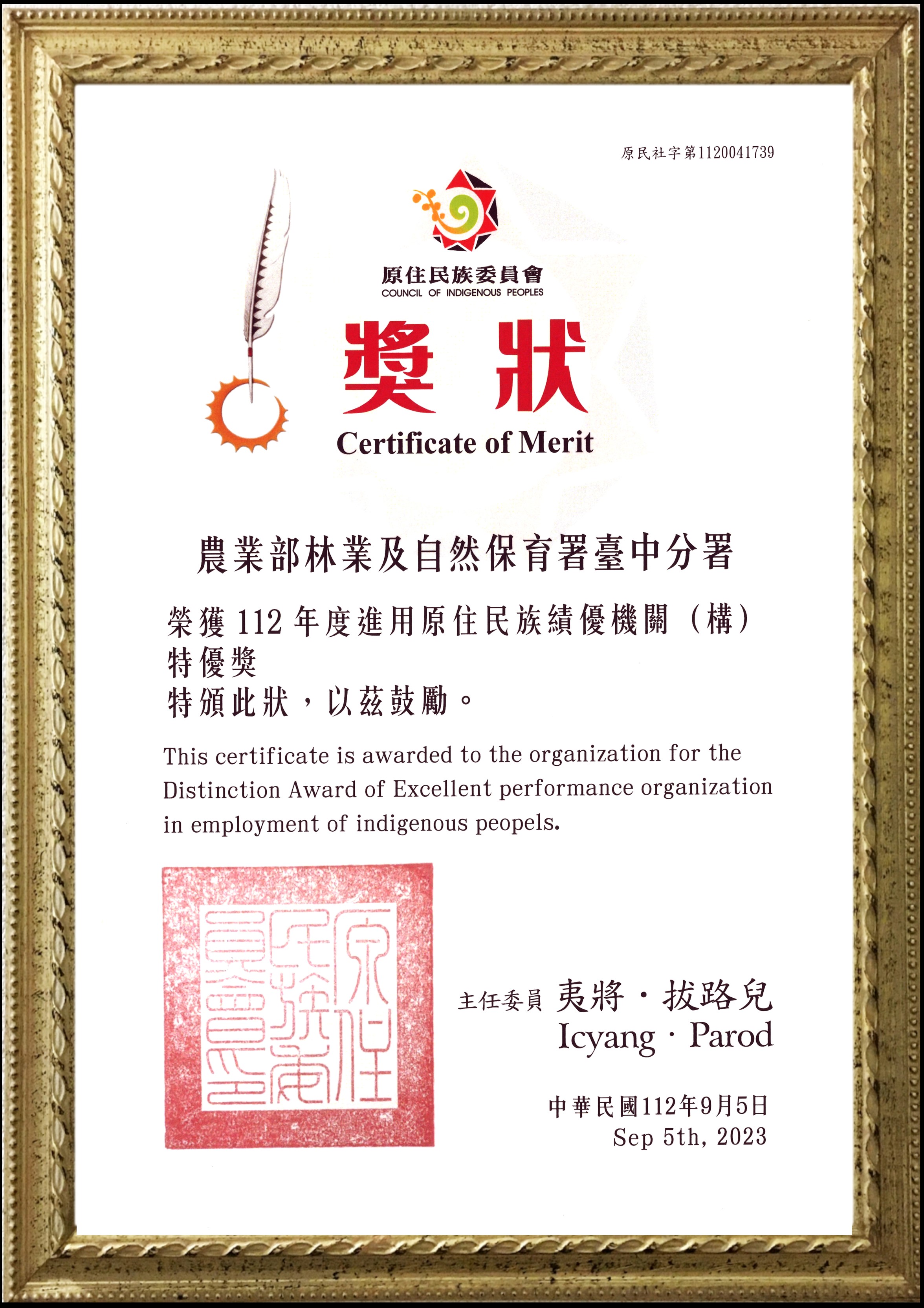 原住民族對於山林有其深刻的情感及生活經驗,本分署力倡原住民族投入山林巡護行列,除可保障原住民族之工作權,更能讓原住民族發揮所長,共創雙贏局面。本分署屬非原住民地區,該獎項獲獎標準為進用約僱等五類原住民比率達5%以上,111年底進用比率高達近27%,對於原住民族工作權之保障績效卓越。