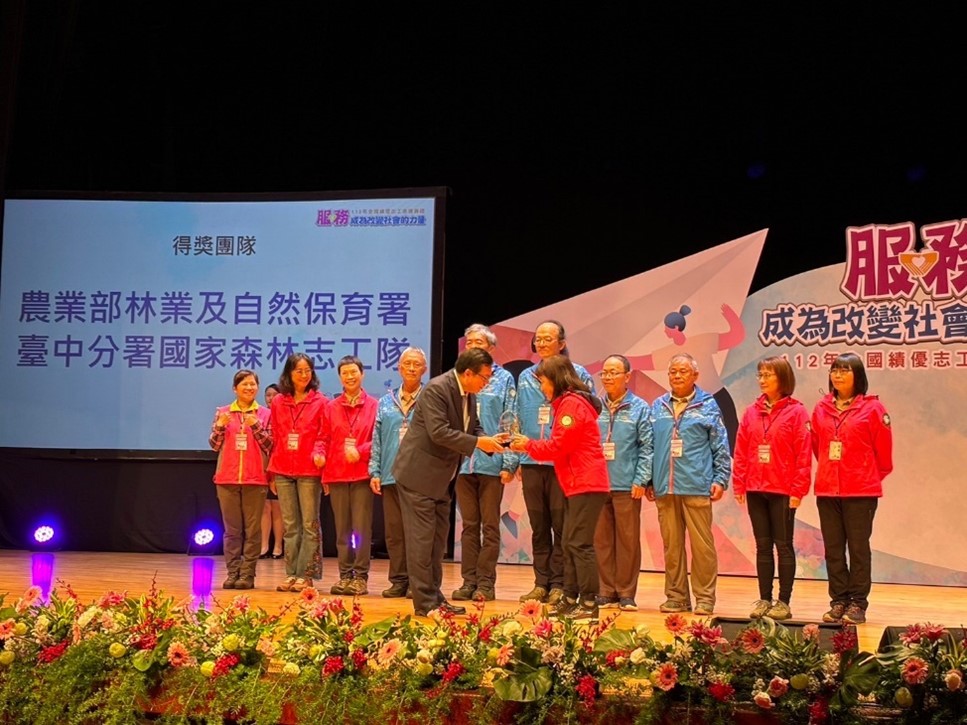 林業保育署臺中分署國家森林志工隊榮獲衛生福利部112年全國績優志工團體獎項,於112年11月30日在國父紀念館接受行政院副院長鄭文燦表揚。本隊志工至今已經超過27年,致力於大雪山、八仙山國家森林遊樂區及東勢林業文化園區等場域環境教育解說服務,並協助山林巡護及不法查緝。在109至111年間,共出勤6,636人次,近4.8萬小時,創造人事成本效益達9百萬元。其中調查監測志工更以實際行動參與山林保育工作,109至111年出勤1,198人次,服勤時數為5,152時,巡護長度11,159公里,近乎是繞行臺灣10周的距離。