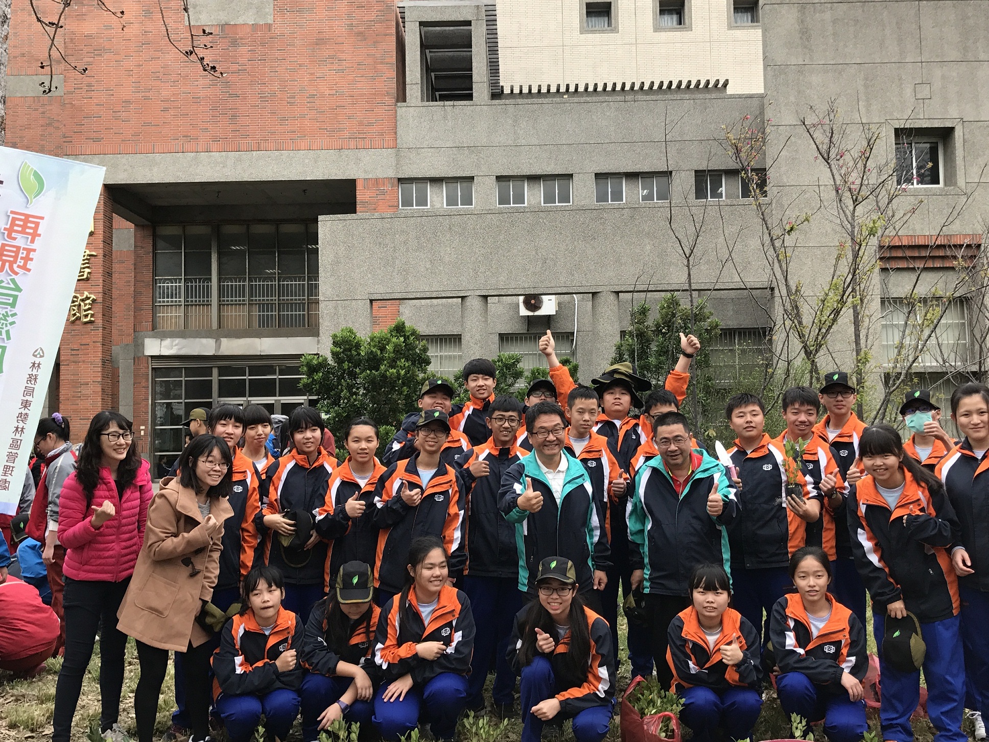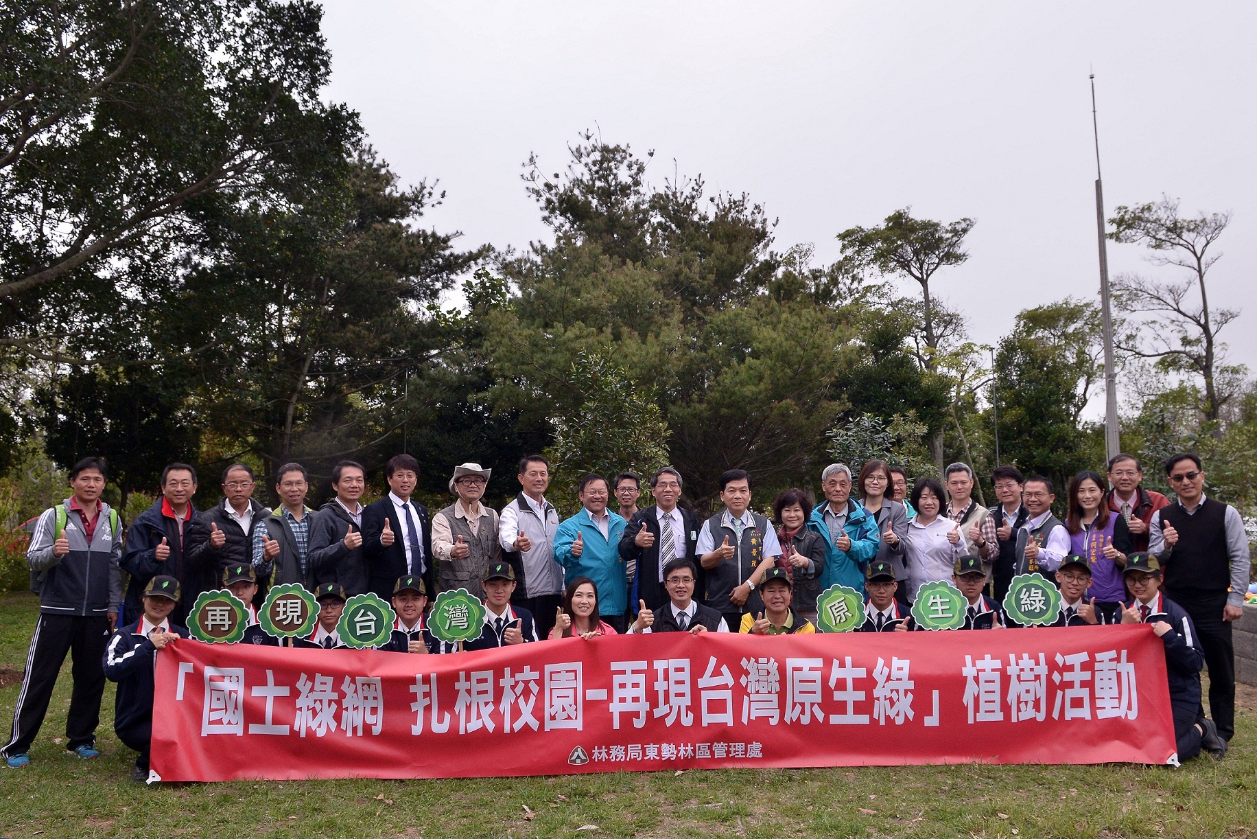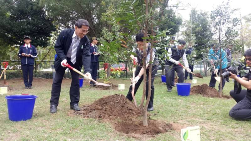東勢林區管理處3月7日號召臺中地區10所學校於臺中市立大甲工業高級中等學校舉辦「國土綠網 扎根校園-再現臺灣原生綠」植樹及護樹活動,在東勢林區管理處處長蕭崇仁、臺中市政府秘書長黃景茂、大甲高工校長簡慶郎及鄰近10間學校校長帶領下,逾500位學校師生,共同種下大頭茶、台灣赤楠、海桐等臺灣原生樹種1020株,並學習如何保護樹木,當場獲得各校師生熱烈響應,讓這些希望的種子,撒到各校角落,提早過一個有意義的植樹節。 活動在各學校的精彩表演中拉開序幕,東陽國小大鼓表演振奮人心,大甲高工熱舞表演嗨翻全場,東勢林管處植樹解說短劇活潑有趣,現場並由財團法人七星環境綠化基金會講師協助學校進行樹木健診,並讓學生親手護樹,專業講解博得滿堂彩,紛紛表示受益良多,未來要成為護樹小尖兵。另為鼓勵種樹,東勢林管處特別邀請各校校長代表上台參加贈苗儀式,數百株樹苗讓學生人手1株,攜回綠化家園,現場並送出桂花及杜鵑600株,讓參與民眾攜回栽植,共同為地球環境盡一份心力。 東勢林區管理處蕭處長崇仁表示,大甲為西部沿海城鎮,南面緊鄰大安溪,是建構國土生態保育綠色網絡(簡稱國土綠網)聯繫海岸與山脈的重要區域,為致力打造聯繫海岸與山脈之間最堅強的綠色安全網,達到永續環境目的,本次活動讓學生親手植樹並學習如何護樹,同時瞭解樹木與生活之關聯性,以彰顯森林永續教育意義,再現台灣原生綠。 東勢林區管理處3月份還有一系列的贈苗活動,詳細贈苗資訊,歡迎民眾上。林務局官網「再現台灣原生綠-107年植樹月系列活動」網頁查詢。