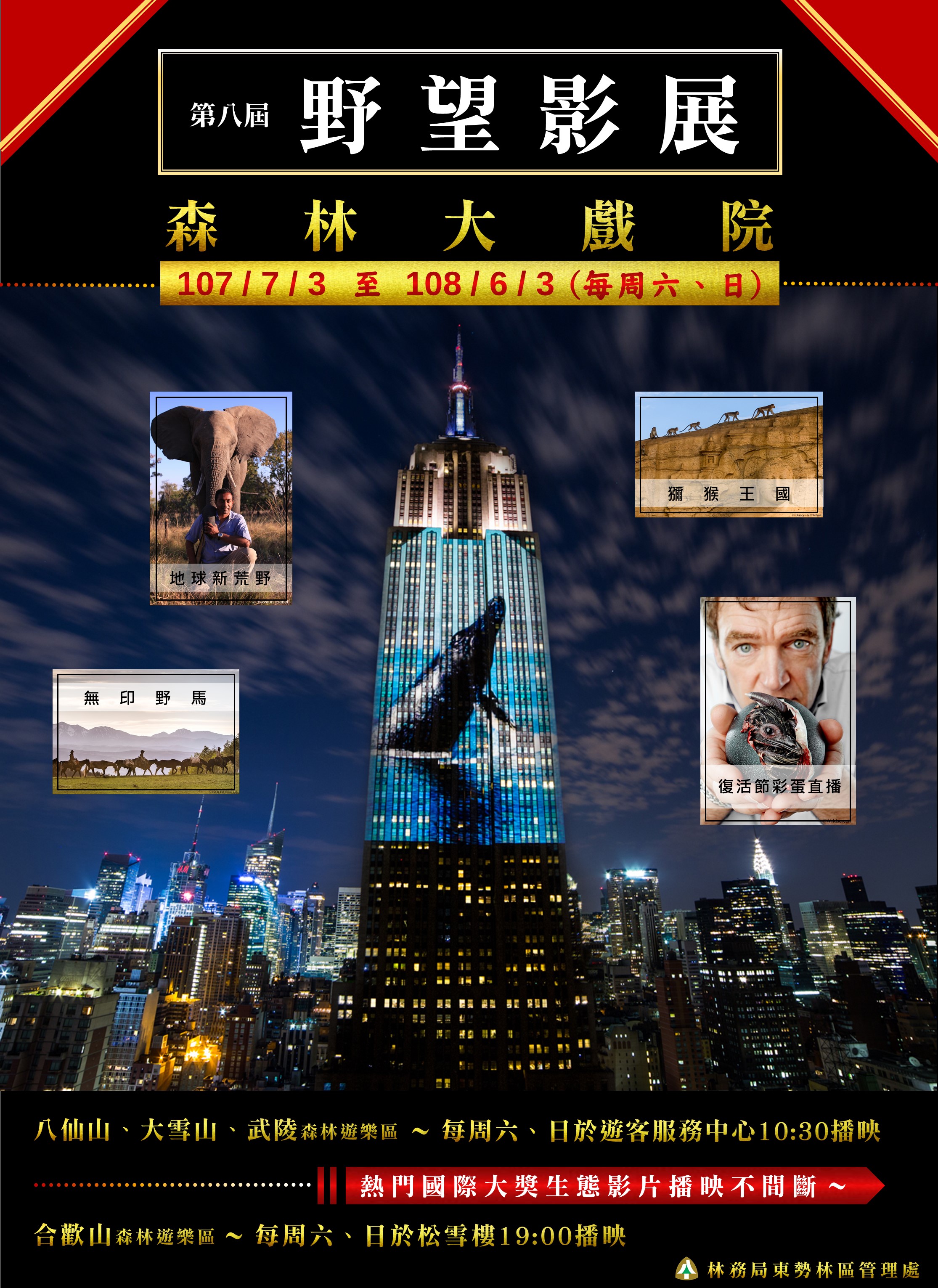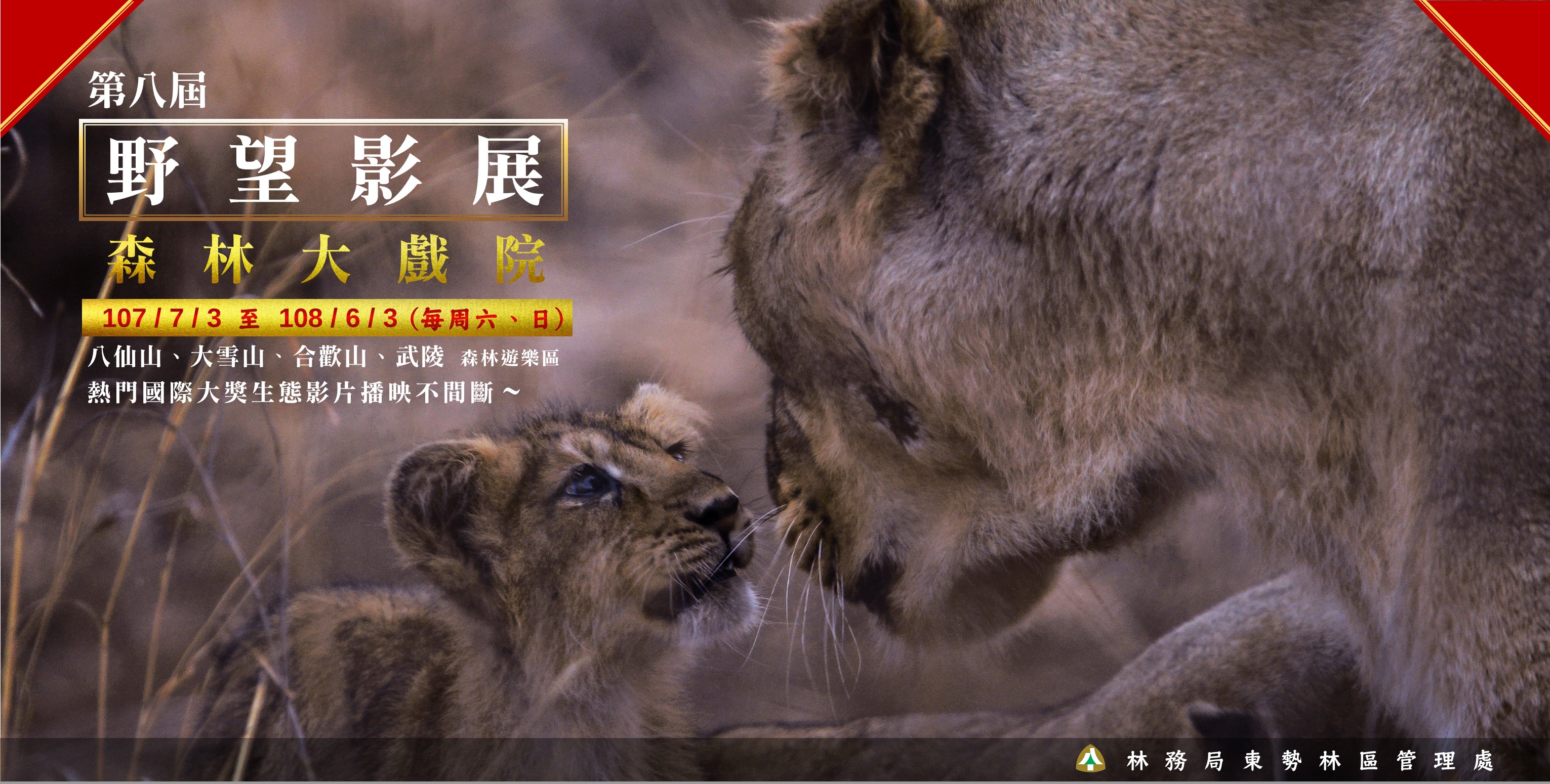 東勢林區管理處配合林務局籌辦「2018野望影展 森林大戲院」活動,107年7月起至108年6月30日,每周六、日10:30於轄屬大雪山、八仙山、武陵遊客中心、19:00於合歡山國家森林遊樂區(松雪樓)分別播放雪虎行動、孤熊重返自然、復活彩蛋直播、亞馬遜森蚺一族等20部精采生態紀錄影片,誠摯邀請民眾現場報名免費入座。 暑假不留白,東勢林區管理處邀請家長與老師帶著孩子們,一起前往中部避暑勝地八仙山、大雪山、武陵、合歡山森林遊樂區,體驗園區獨特的地理環境及季節氣候,園區含蓋暖、溫、寒帶闊葉林及針葉林,豐富的生態資源成為野生動物棲息樂園,隨著步道穿梭於林木間,沐浴在富含負離子、芬多精的森林生態環境中並欣賞國際獲獎的生態紀錄片,一次滿足知性與感性的消暑體驗,盡情揮灑難得的假期,堆疊出多采多姿親子共同的美麗回憶。 透過影展,讓我們認識世界各處的自然生態,培養具有全球視野的國際觀,也讓我們看見地球上奇特的生命與自然景觀,一起見證生命演化的悸動、環境的變幻、世界各地不同角度的觀察與省思,更能看見拍攝一部高度水準的生態紀錄片為之動容的用心與深情。為台灣自然生態保育及環境教育栽下希望之苗。 相關影展資訊請洽八仙山遊客中心(04)25951214、大雪山遊客中心(04)25877902、武陵遊客中心(04)25901020、合歡山松雪樓(049)2802980或臺灣山林悠遊網: http:// recreation.forest.gov.tw查詢。