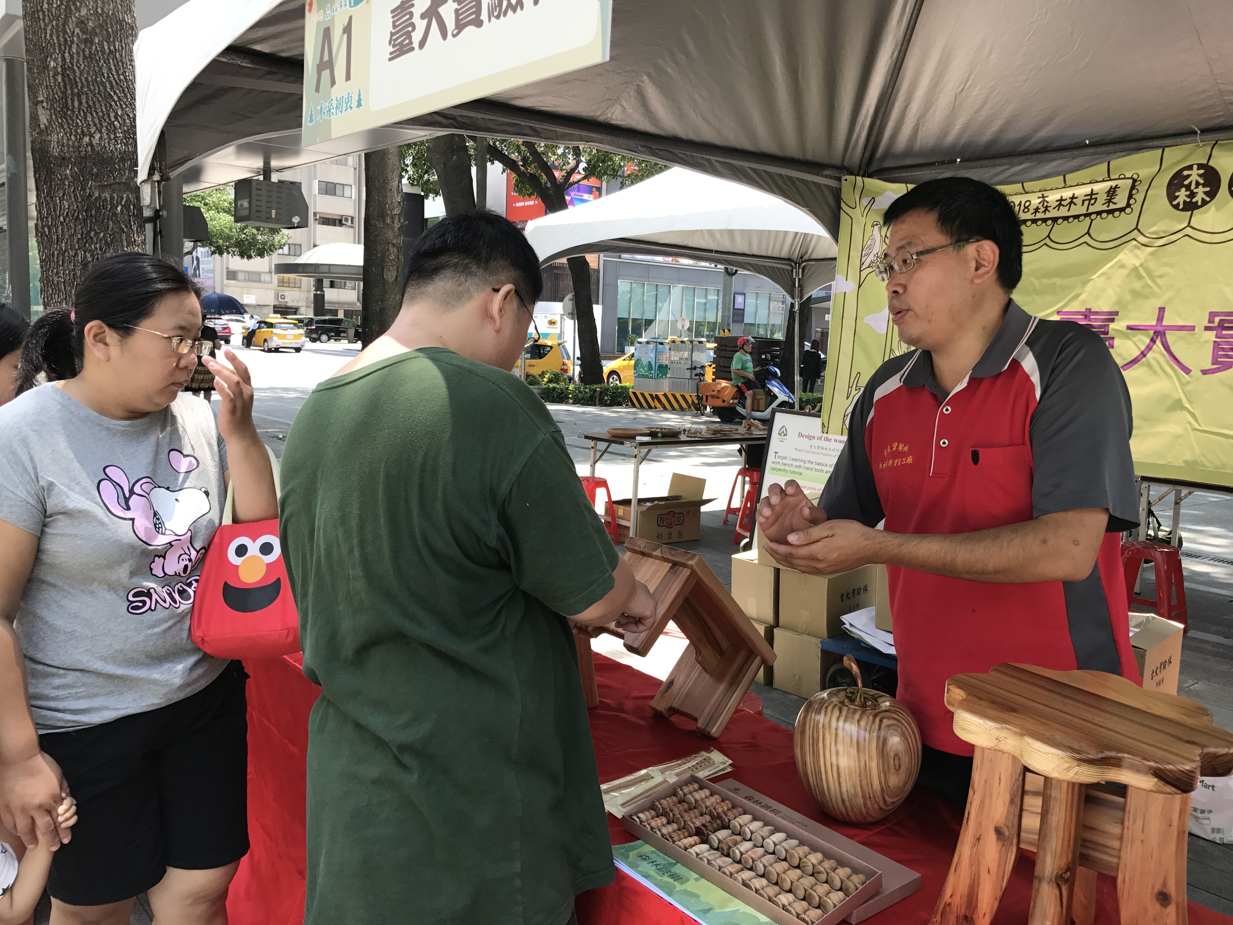 為了推廣國產材,及林務局「國產材臺灣館-森之屋」於2018臺中世界花卉博覽會宣傳暖身,林務局東勢林區管理處於7月14日在臺中草悟道辦理「2018森林市集臺中場-五木森活」,活動當日參加人數逾4000人,活動圓滿結束。 「2018森林市集臺中場-五木森活」以「五木森活」為主題,讓大家在日常生活中就可以落實木系饗食、木系美學、木系宜居、木系手創和木系初衷等五個概念,分別代表飲食產品、美妝保養保健用品、家具擺飾、文創產品與木系產品,藉此推廣木竹材的使用,當日有三義壓箱寶、鄉村玫瑰木作設計、永霆國際竹炭實業、CAS林產品、淞杉木藝、元泰竹藝社、樂樂木、木匠兄妹、昆儀實業、華陀益生國際企業、東勢角文創工坊、玩偶的家、Co2設計木作工房、山水亭銘木漆器工作室、勵林貿易有限公司、陳皇寶藏木工坊、新萬吉木材行、愛迪雅實業、和誼創新、蜂神有機養蜂場等,為臺灣木竹材默默努力的國有木竹廠商到現場擺攤,現場提供天然國產材日常生活用品應用,如竹吸管、竹炭枕、竹炭片、竹醋液、護膝、木樂器、木容器、木醋液、樹萃手工皂、青草茶、防蚊液、月草萃取面膜等優良產品,以增加民眾對國產材的認識與瞭解,也期望民眾能多踴躍選擇合法的國產材產品取代進口木製品,一起為節能減碳努力。 東勢林區管理處更提供帝雉、銳葉高山櫟手機座組成及彩繪DIY,現場大小朋友都踴躍報名,除了有趣又好玩以外,DIY成品更可以帶回去做成手機的家。現場更有集點換杯墊的活動,舞台區安排有獎徵答活動,讓活動熱鬧有趣。並配合國產木竹材的概念,邀請使用本土研發的竹打擊樂器及傳統的竹管樂器「臺灣竹樂團」;以木質弦樂器演奏的「聞韶軒絲竹室內樂團」;及以木質吉他演奏邊邊樂團,以木竹樂器的悠揚樂聲,陪伴森林市集的民眾們度過悠閒的週末。