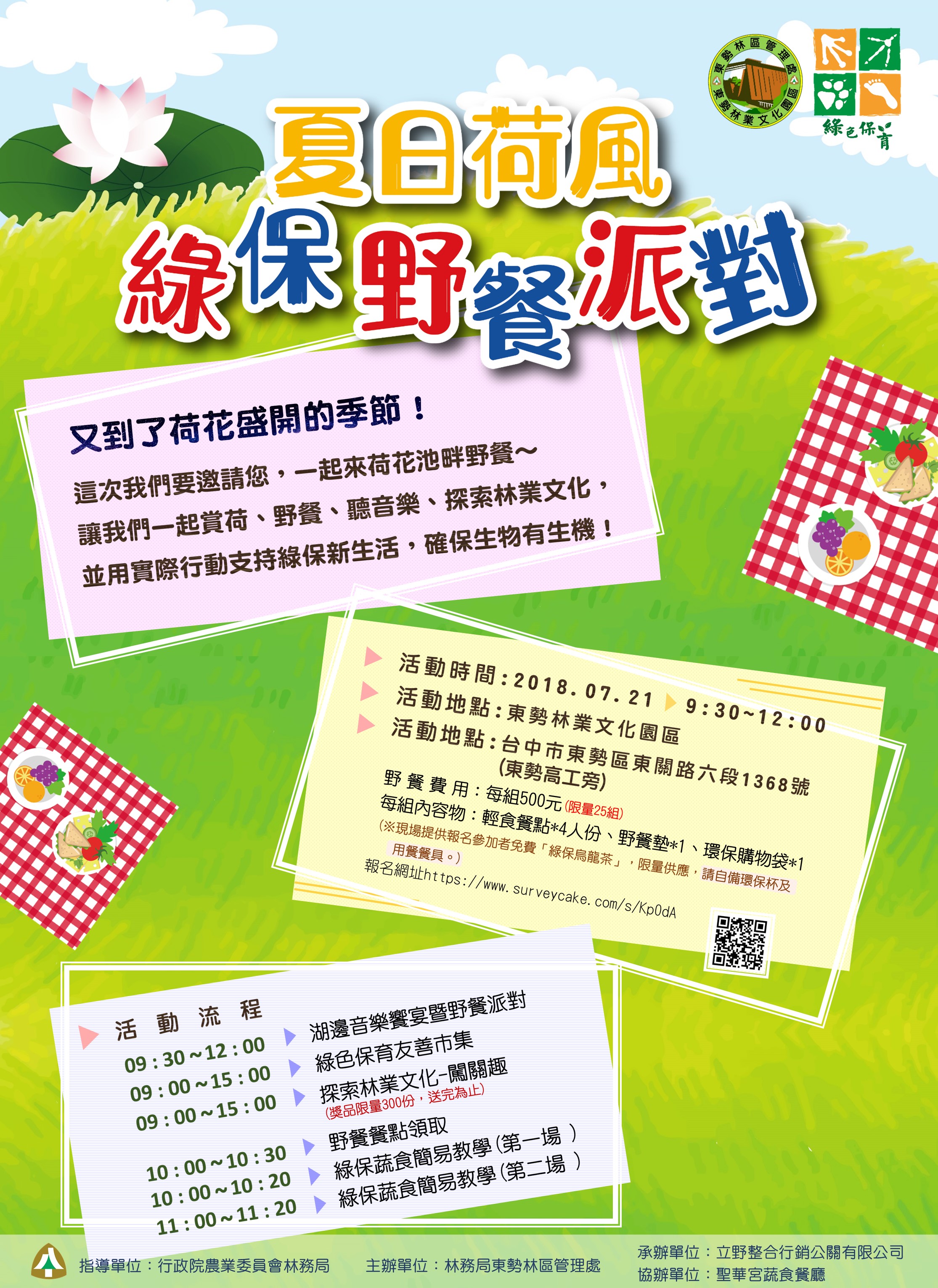 東勢林業文化園區「夏日荷風-綠保野餐派對」活動,於7月21日星期六登場,野餐餐盒組雖已網路預約額滿,若您未能完成報名,仍歡迎您自備輕食餐點,一起來賞荷、野餐、聽音樂,參加探索林業文化闖關拿獎品活動,並一起用實際行動來支持綠色保育友善農業。 林務局東勢林區管理處表示,為提供民眾暑假期間寓教於樂的活動選擇,特別安排於荷花盛開季節,舉辦本次活動,野餐餐盒組採用了綠色保育友善農業的健康食材,讓參加民眾吃得巧、吃得安心,又可藉由實際行動來支持綠色保育,降低環境中農藥、化學肥料的使用,進而保護野生動物的棲息環境,維護生物的多樣性。 本活動原規劃提供網路預約報名民眾野餐墊席地而坐,惟依中央氣象局預測,本周末台中地區有些許降雨機率,主辦單位特別於活動現場備有戶外休閒傘及座椅提供報名民眾使用。 未能及時報名的民眾,亦可自備輕食餐點,或購買活動現場「綠色保育友善市集」的食品,一起來賞荷、聆聽精采的小提琴等音樂表演,參加有趣的「探索林業文化闖關拿獎品活動」及精緻的「簡易綠保蔬食教學」,希望透過本次活動,讓大家以輕鬆愉快的方式來認識東勢林業文化園區,並瞭解友善農業、綠色保育的重要性,一起過個充實愉快的週末時光。