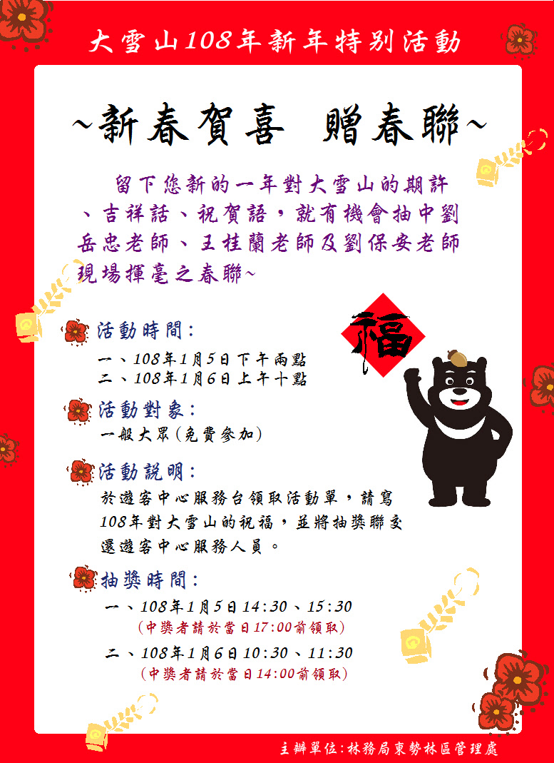 春節氣息越來越濃,東勢林區管理處為迎接金豬年來臨,特邀請劉保安、劉岳忠、王貴蘭等書法名家於1月5日(週六)下午14點起、1月6日(週日)上午10點起於大雪山森林遊樂區遊客服務中心現場揮毫,所寫春聯免費抽獎贈送現場遊客,與您結緣賀新春! 春季的大雪山是國際知名的賞鳥據點,不僅鳥類資源豐富,部分種類更是彌足珍貴而罕見!大雪山擁有千變萬化的雲海景觀、絢麗多彩的美麗晚霞以及原始的森林景緻,誠摯邀請您於新春期間闔家蒞臨,提前感受春天生機蓬勃的氣息。 欲了解大雪山森林遊樂區相關資訊,請上林務局「台灣山林悠遊網」:http://trail.forest.gov.tw/index.aspx、東勢林區管理處網站:http://dongshih.Forest.gov.tw查詢,或洽大雪山遊客服務中心(04)25877901。
