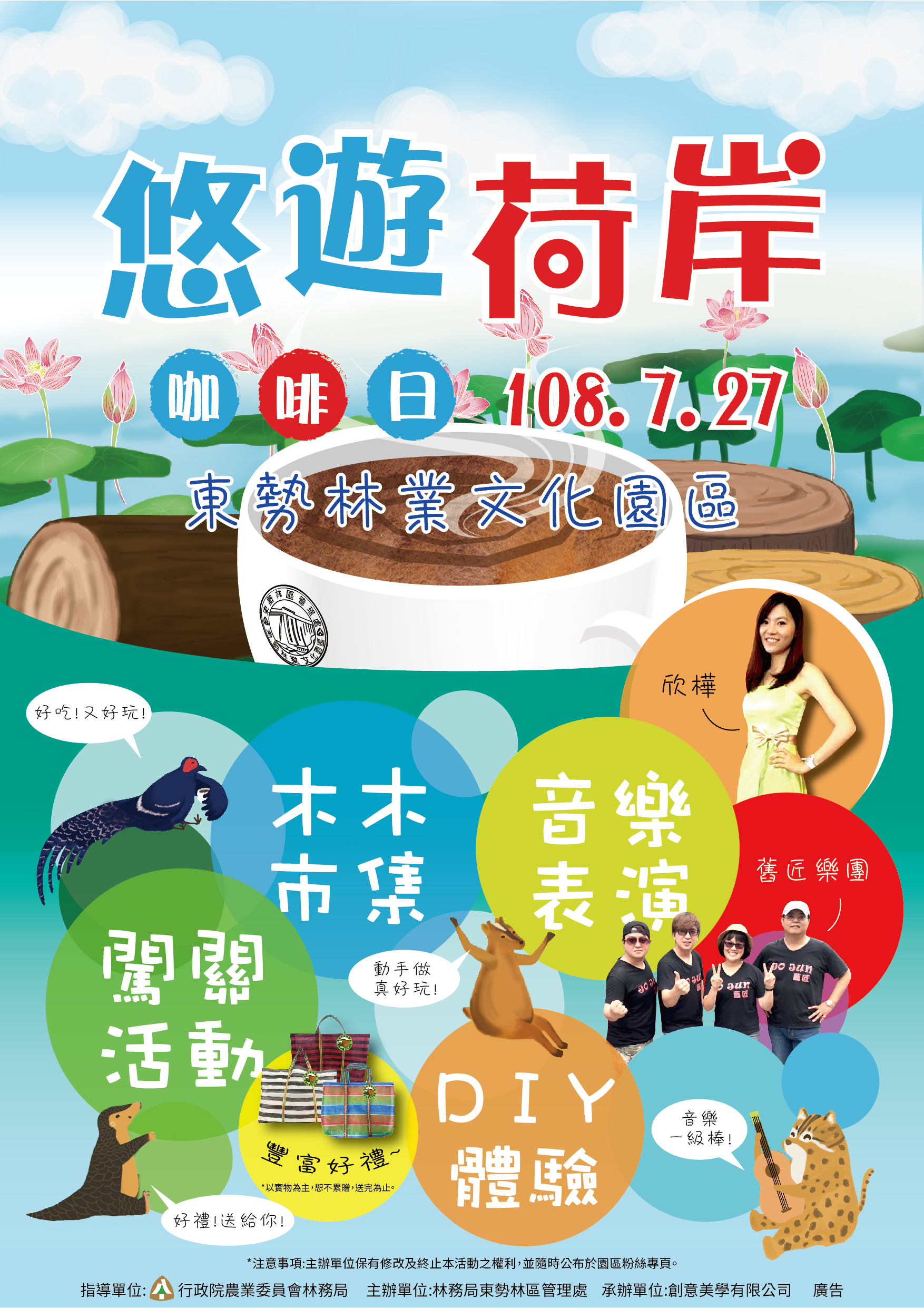 夏日暑期來到,荷花朵朵盛開,近年來東勢林業文化園區的生態貯木池,每到7、8月都能見到滿片翠綠的荷葉中盛開著粉嫩荷花,已然成為中部最佳的賞荷景點,趁著荷花盛開時節,林務局東勢林區管理處將於7月27日星期六上午10點至下午4點舉辦「悠遊荷岸咖啡日」活動,邀請大家走入園區賞荷花、品咖啡、聽音樂、逛市集,悠遊荷岸、輕鬆一夏。 活動當天,舞臺區將安排精采的表演節目、有獎徵答趣味互動,並結合園區內特色建物規劃闖關活動、文創DIY體驗及木木市集等,讓民眾透過多樣活動更加認識東勢林業文化園區的文化之美;另外,這次「木木市集」將邀集木工、木創以及友善環境耕作等不同領域的夥伴,共同推廣森林永續經營及綠色保育等理念,還特別準備友善耕作咖啡提供民眾免費試飲品嘗,數量有限,請好好把握機會喔! 東勢林業文化園區不只是最佳賞荷景點,也是兼具自然生態、林產工業史蹟保存、木雕藝術展示之多元休憩及環境教育場域,為推廣文化園區及宣導森林多元服務價值等理念,從今年夏季開始至明年年底,每月每季皆會推出不同的主題活動,打造專屬東勢林業文化園區嘉年華系列活動,歡迎民眾隨時關注園區粉絲專頁相關活動訊息。 ※每場次均安排有優質的「木木市集」,請參加活動民眾記得自備購物袋及環保杯等餐具,共同環保愛地球。 ※東勢林業文化園區粉絲專頁網址 https://www.facebook.com/DongshihForestryCulturePark/