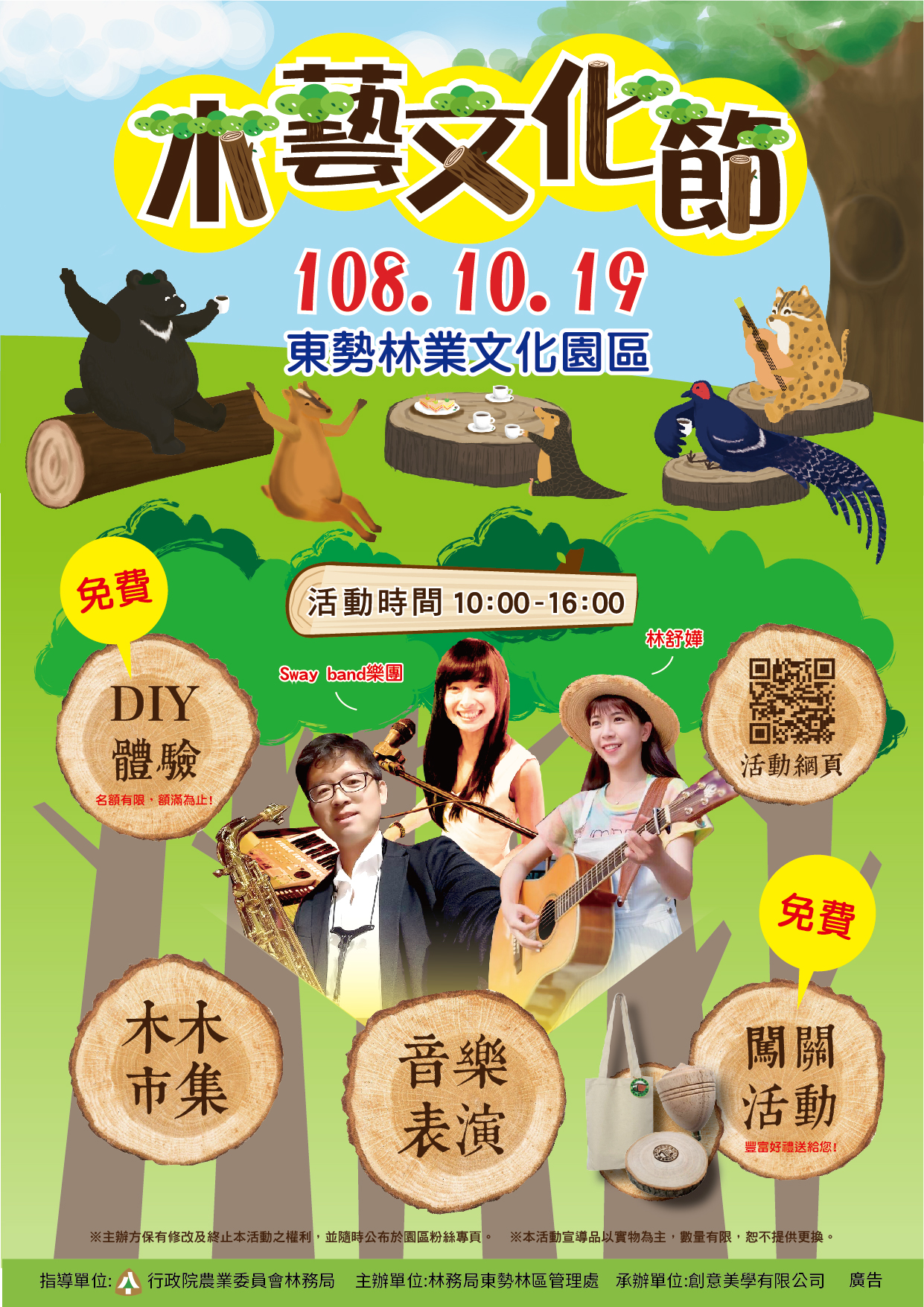 東勢林業文化園區前身為大雪山林業公司,過去曾為臺中山城創造輝煌的林業歷史與文化,林務局東勢林區管理處為傳承再生園區的人文風采與歷史意義,將在10月19日(六)為民眾帶來一場優質的文化饗宴「木藝文化節」,以木藝美學為主題,結合園區內珍貴的林產工業史蹟、國際級大師的木雕作品與現代的木藝創作,帶領大家深入認識東勢林業發展的軌跡,欣賞東勢林業文化園區的秋季風采。 東勢林業文化園區不僅有舒適愜意的森林環境,在步道兩側更有多組深具意義及文化風格的國際級木雕作品,提供民眾在園區裡漫步細賞,而此次在「木藝文化節」中,特別邀請東勢在地知名木藝單位,與多位木工藝師、木藝愛好者齊聚一堂,共同展示山城地區的木工藝文化成果。另有多種免費限量的「木作文創DIY」、園區專屬的「木木市集」與音樂藝術表演,邀請民眾一起享受木藝文化的魅力,為大家帶來多元又具知性深度的休憩體驗。 趁著天高雲淡、秋風漸爽的周末,林務局東勢林區管理處誠摯地邀請大家同來探訪東勢林業文化園區,感受木頭帶來最舒適的溫度,欣賞精湛的木藝美學、享受森林與音樂,過個充實愉快的週末假期吧! ※東勢林業文化園區粉絲專頁 ※東勢林業文化園區108-109年系列活動