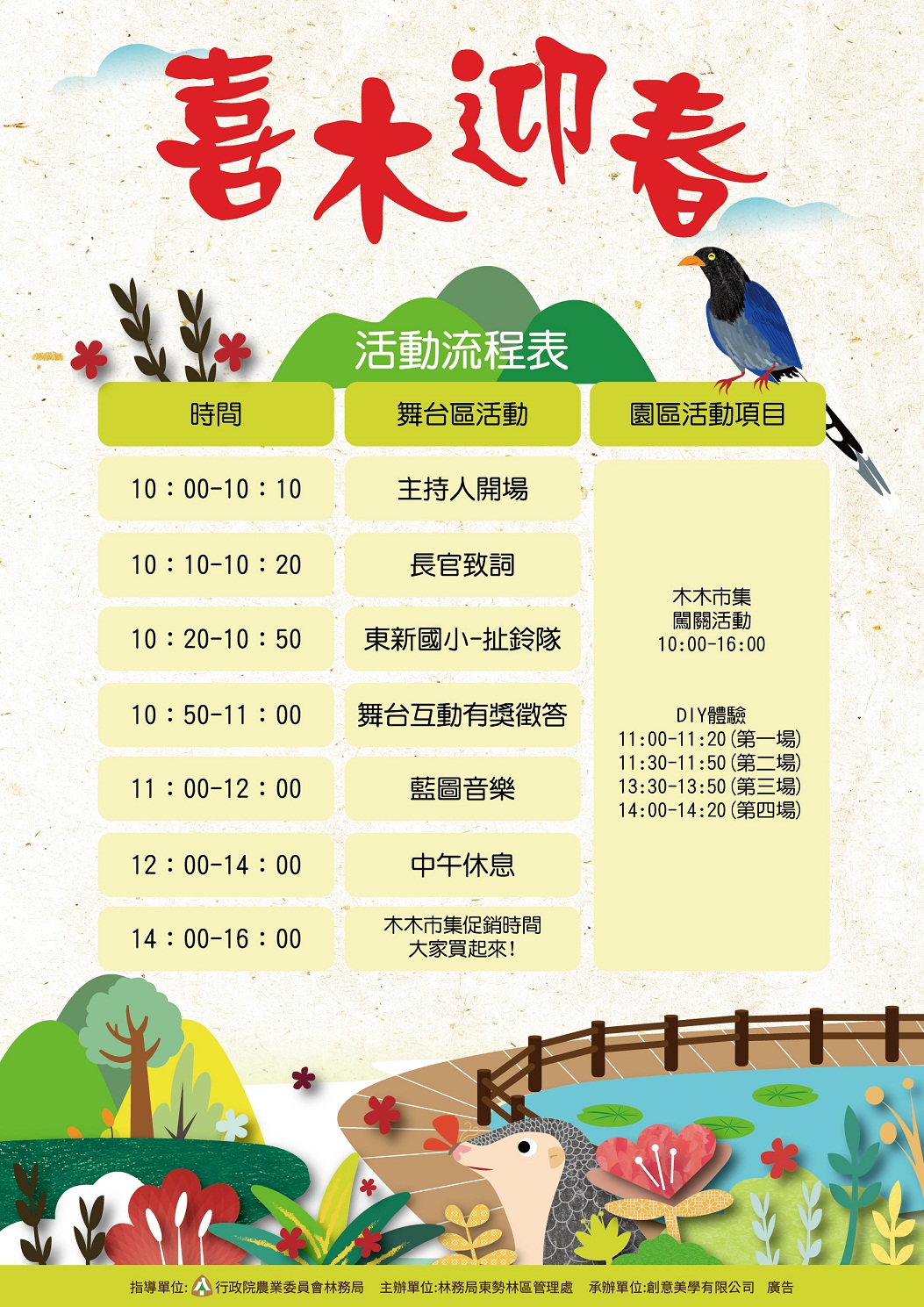 為了迎接2020年,林務局東勢林區管理處將於109年元月4日(星期六)舉辦「喜木迎春」活動!位於台中東勢區的東勢林業文化園區是一座擁有珍貴林產工業史蹟與豐富生態環境的森林秘境,在108年經過東勢林管處的精心規劃,已完善了園區環湖步道等設施,此次元月的主題活動,以好玩的木作文創DIY結合農曆新年作為主軸,歡迎民眾一同提前來歡樂迎春,同時漫遊環湖步道欣賞湖光山色、享受森林芬多精。 在元月4日活動中,特別邀請了東勢在地知名藝術家-徐菊英老師現場指導民眾書寫喜慶小春聯,並搭配木製吊飾或明信片,製作專屬喜木迎春紀念品,不僅如此,當天徐老師團隊將現場免費贈送新年春聯(數量有限,送完為止),希望提前與遊園民眾分享新年喜慶。除此之外,活動中還有專屬園區的「木木市集」以及免費闖關活動,舞台區更是邀請到東新國小-扯鈴隊及藍圖音樂表演團隊為大家帶來精彩的音樂藝術表演,希望帶給大家歡喜迎新春的美好週末假期。 東勢林業文化園區從今(109)年元月開始,每月都將推出不同的主題活動,結合園區四季美景、森林多元服務價值、綠保永續理念等,規劃適合不同年齡層的活動內容,歡迎各地民眾一同來體驗。林務局東勢林區管理處誠摯邀請您元月4日一起來喜木迎新春! 詳情參閱東勢林業文化園區粉絲專頁或東勢林業文化園區108-109年系列活動網頁。