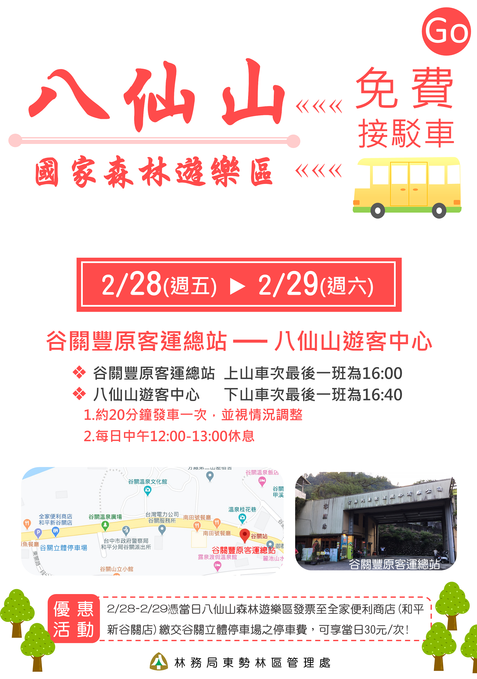 武漢肺炎防疫期間,想安排健康的戶外行程,到山區「森」呼吸嗎?林務局東勢林區管理處所轄八仙山國家森林遊樂區是您最佳的選擇!漫步在森林步道裡,享受芬多精療癒身心,園區瀑布產生的負離子,更能增強免疫力! 八仙山國家森林遊樂區為鼓勵民眾出遊,以五感體驗的方式感受森林,於228連續假期三日特別推出森林療癒之體驗活動「尋找彩虹」,內容為連假期間在園區內蒐尋七種彩虹顏色並拍照,並於官方臉書打卡按讚,就有精美好禮送給你!數量有限,贈完為止。此外,2/29還有國家森林志工帶領「穿越歷史遊八仙」之定點歷史導覽(10:00與14:00共兩場);及2/29-3/1「泰雅文化DIY」(每日10:30,每場20名)與「泰雅風情搗麻糬」(每日13:00,每場50名)活動,以上活動請至八仙山國家森林遊樂區遊客服務中心報名,歡迎民眾共襄盛舉!另外,為了維持遊憩品質,林務局東勢林區管理處於2/28-29提供谷關(豐原客運谷關站)至八仙山遊樂區之免費接駁車,時間為早上9點至下午5點,凡持有八仙山國家森林遊樂區入園發票,至谷關立體停車場旁全家便利商店繳費,可享當日30元/次之優惠,請遊客多多利用! 林務局東勢林區管理處表示,為防範疫情,園區內已全面加強防疫工作,不僅第一線服務人員均配戴口罩,每日均辦理酒精或消毒藥劑消毒作業,歡迎連續假日攜帶親朋好友來八仙山國家森林遊樂區享受森林浴!入園前再次的提醒您,為維護環境清潔及防範森林火災,全區禁止野炊、烤肉及吸菸,請民眾務必配合。八仙山森林遊樂區設有小木屋住宿及餐飲服務,訂房、餐點請洽台中商旅八仙山莊:04-25950266。園區旅遊資訊請洽八仙山國家森林遊樂區遊客服務中心:04-25951214。