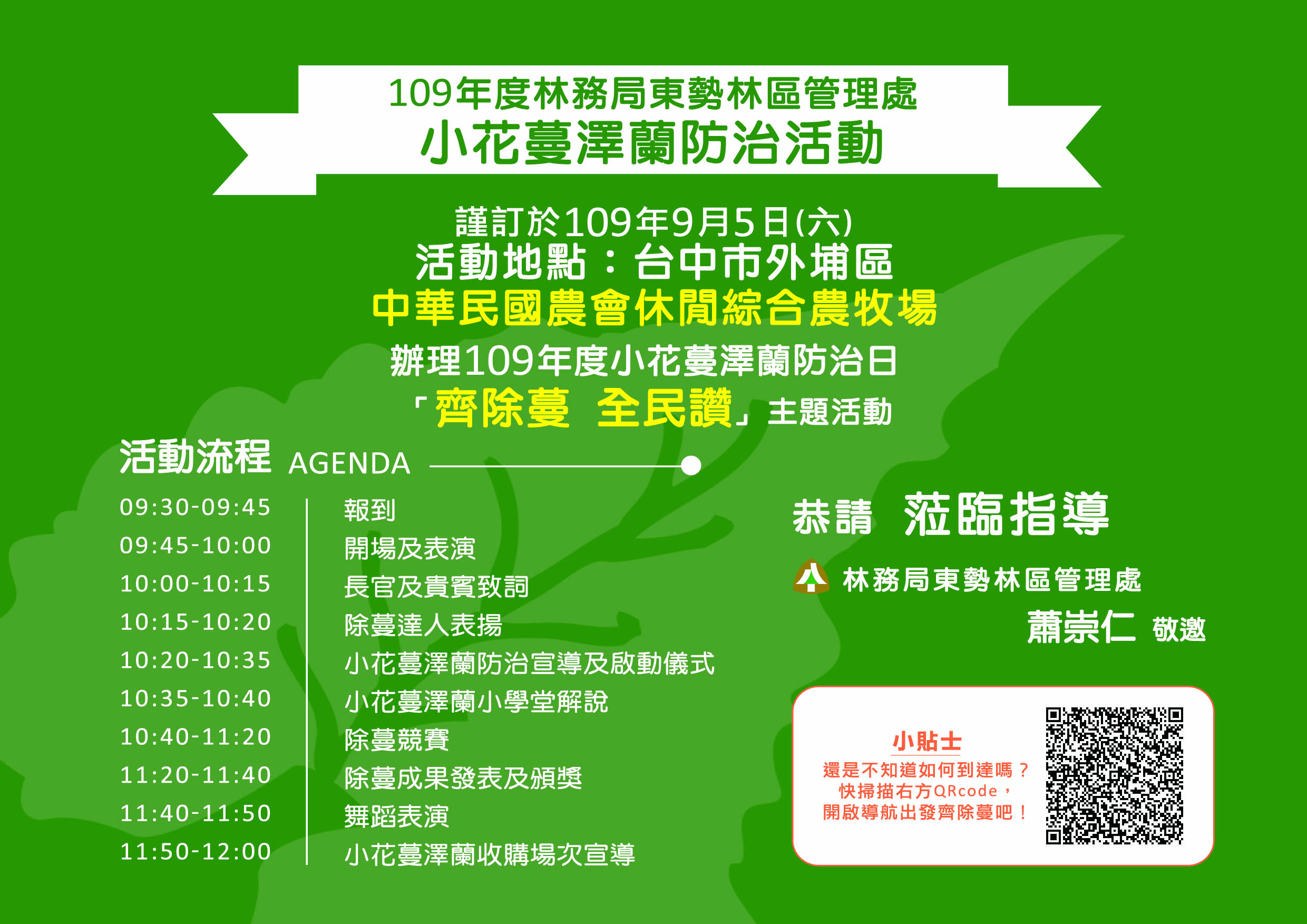 小花蔓澤蘭有「植物殺手」及「綠癌」的稱號,生命力旺盛的它,每平方公尺可產生高達十七萬粒種子隨風散播,在台灣中低海拔地區橫行無阻,為防除小花蔓澤蘭入侵,林務局東勢林區管理處將於109年9月5日(星期六)上午9時30分至12時,假中華民國農會休閒綜合農牧場(台中市外埔區二崁路700號)辦理「齊除蔓‧全民讚─109年度小花蔓澤蘭啟動日活動」,宣示除蔓決心,廣邀民眾參與小花蔓澤蘭收購活動,現場將以每公斤5元的價格進行收購。 活動當日由處長蕭崇仁帶領外埔區鄉親共同宣誓除蔓護地球,另安排馬鳴國小舞獅隊、水美社區韻律舞蹈等精彩表演、小花蔓澤蘭防治解說、廉政宣導及除蔓競賽等節目,競賽拔蔓最多的團體,可獲得正隆股份有限公司后里分公司贊助的「蒲公英抽取式衛生紙」,鼓勵大家共襄盛舉一起動手防除。另現場也有設置收購處,呼籲民眾若在居家附近發現小花蔓澤蘭蹤跡,務必連根拔起、裝入塑膠袋內,送至現場以每公斤5元的價格收購,歡迎民眾、企業、民間團體一起加入小花蔓澤蘭防治工作的行列,共同維護生態環境。 東勢林區管理處指出,小花蔓澤蘭葉子呈現「心型」,原產於中南美洲,為一年生攀爬植物,其繁殖力強盛、不易根除,常藉由莖蔓攀附纏繞原生植物,遮蔽陽光,使原生植物無法行光合作用而死亡,當林木大面積遭其侵害死亡後,林地將裸露而失去保護力,再遇颱風、豪雨發生時恐有崩塌危險,進而危害生命財產及日常生活。為有效防除,建議在每年10月至翌年2月開花期來臨之前,進行防治工作。 東勢林區管理處自9月起將辦理一系列小花蔓澤蘭宣導及收購活動,詳細收購時間及地點,可至東勢林區管理處官網查詢,或電洽04-25150855#151。