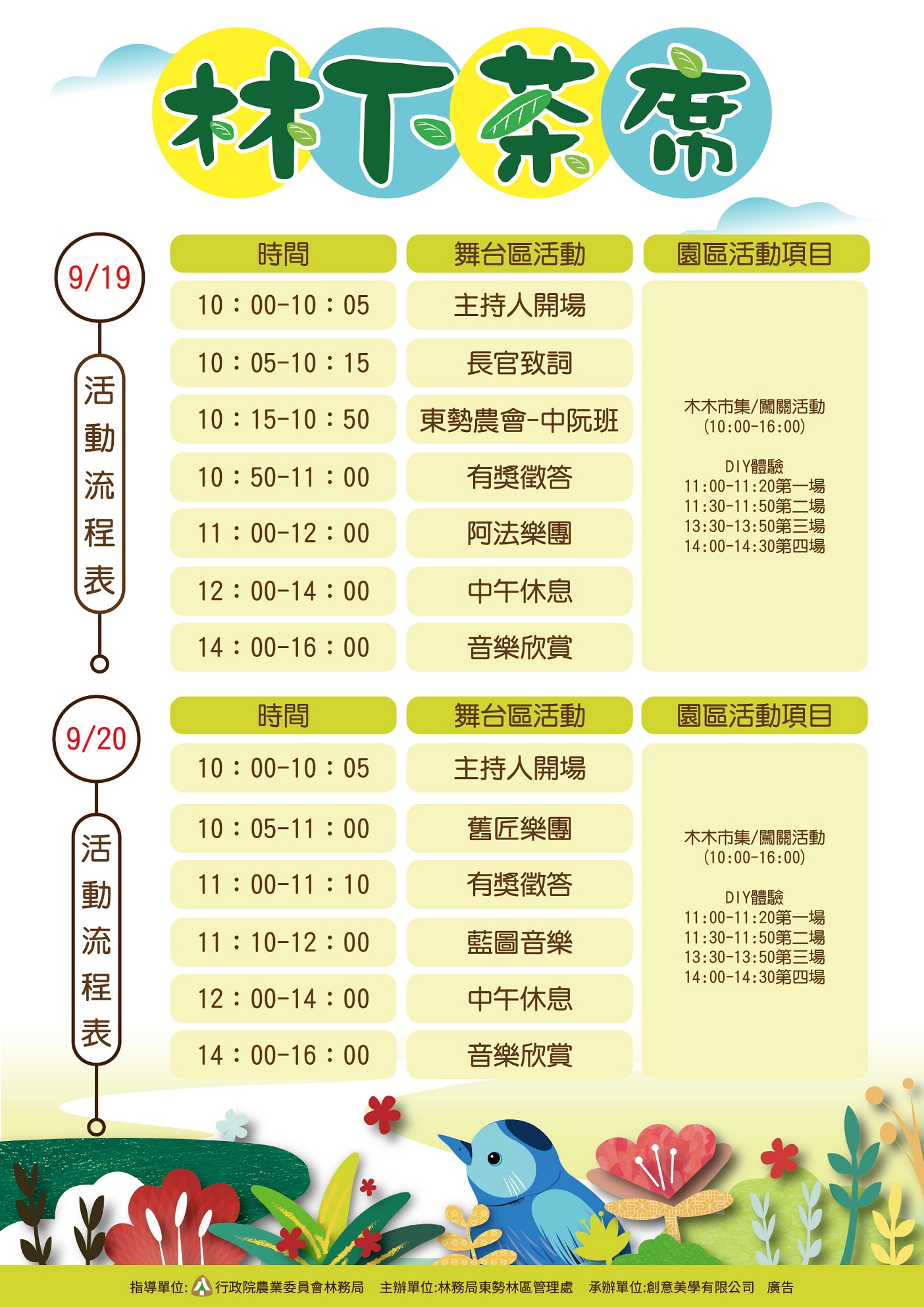 時序漸入秋,隨著氣候的轉變,人的情緒也容易受到影響,適當的從事戶外活動,將有助身心健康。林務局東勢林管處為了鼓勵國人多走出戶外親近大自然,將在9月19、20日(星期六、日)於東勢林業文化園區舉辦「林下茶席」活動,邀請您體驗林下清心茶香,還有療癒身心的森林芬多精。 本月的「林下茶席」活動,結合了友善環境的有機茶香、園區專屬的木木市集,還安排有精彩的音樂表演,讓民眾以輕鬆愉快的心情來認識綠色保育理念。活動中還提供有限量免費的森林手作DIY、集章闖關送獎品活動,在這充滿森林芬多精的悠閒環境下,體驗森林多元的服務價值。 東勢林業文化園區為兼具自然生態、林產工業史蹟保存、木雕藝術展示的多元化休憩及環境教育場域,趁著初秋微涼的好天氣,林務局東勢林區管理處誠摯地邀請大家一同來探訪東勢林業文化園區,感受森林最舒適的溫度、最放鬆的美景,不止品味茶香也享受森林與音樂,一起過個充實愉快的周末假期! ※東勢林業文化園區108-109年系列活動網址 http://forestinmylife.mystrikingly.com ※東勢林業文化園區粉絲專頁網址 https://www.facebook.com/DongshihForestryCulturePark/