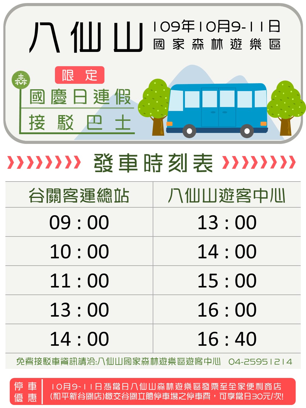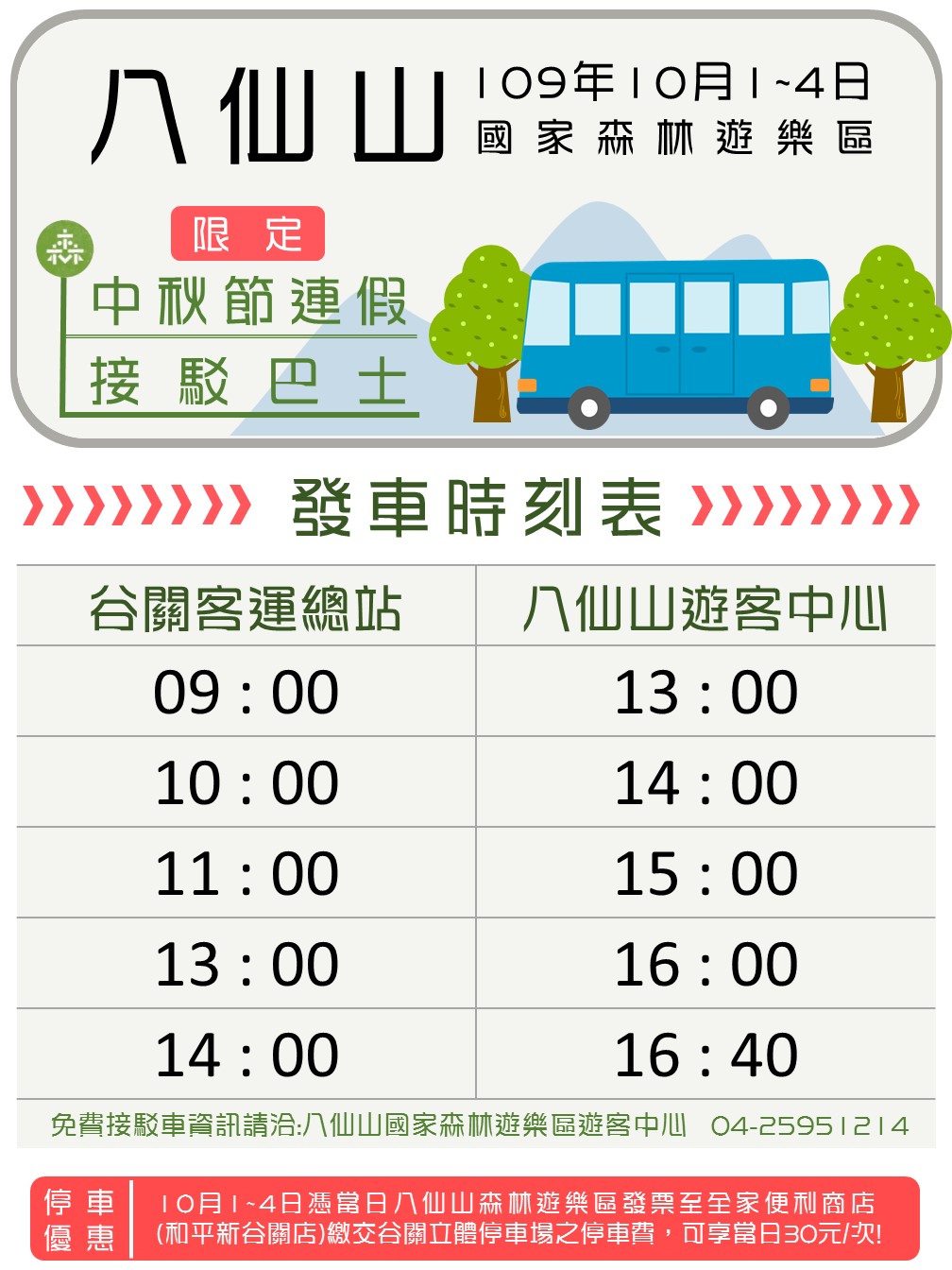 時序入秋,正是適合親友一同出遊的時節。林務局東勢林區管理處所轄八仙山國家森林遊樂區鄰近秋季好湯之谷關溫泉遊憩區域及谷關七雄步道,是享受登山健行、泡湯賞月親子旅遊的最佳選擇! 林務局東勢林區管理處表示,本次林務局推出13處國家森林遊樂區10月1日至11日享半價入園優惠,若之前已使用過免費入園一次方案之民眾,可趁此時機再次來訪八仙山!另外針對連續假日期間(10月1日至4日、10月9日至11日)園區也有提供谷關(豐原客運谷關站)至八仙山遊樂區之免費接駁車,凡持有八仙山國家森林遊樂區入園發票,至谷關立體停車場旁全家便利商店繳費,可享當日30元/次之優惠,請民眾多多利用! 林務局東勢林區管理處提醒您,山區遊玩時應注意自身安全,另提醒請配合園區內全面禁止吸菸、炊煮、溯溪、釣魚和攜帶寵物等相關規定,避免影響遊玩興致。八仙山森林遊樂區設有小木屋住宿及餐飲服務,訂房、餐點請洽台中商旅八仙山莊:04-25950266。園區旅遊資訊請洽八仙山國家森林遊樂區遊客服務中心:04-25951214。