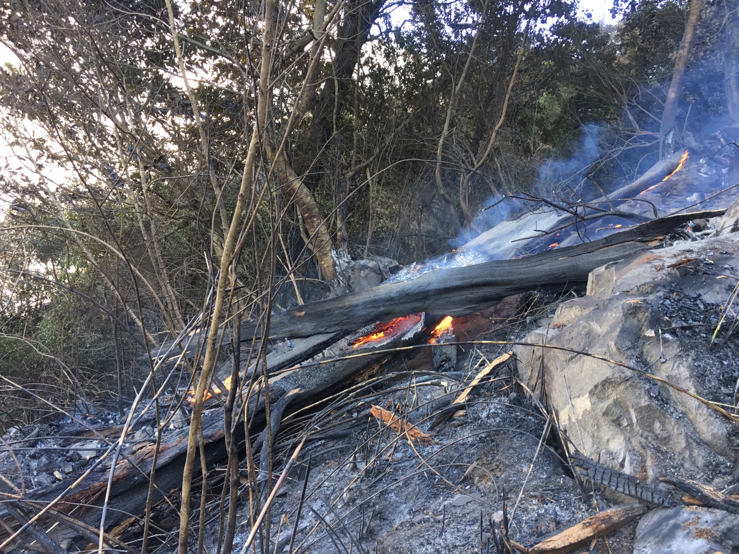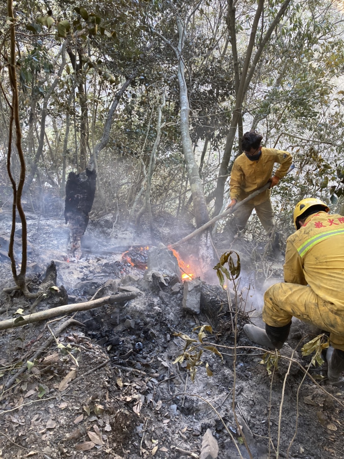 年節前夕,臺中市和平區八仙山事業區第85林班(中橫便道19.3K)傳出森林火災,東勢林區管理處迅即於今(2/7)日動員森林護管員並協調台中市政府消防局、空勤總隊第二大隊及內政部警政署保安警察第七總隊第五大隊支援,總計62人投入火場救援,在歷經8個小時地面及空中全力搶救後,成功控制火場下邊坡火勢,並持續全力控制中橫便道上邊坡火勢。 東勢林區管理處表示,該處共動員50名人力,犧牲假期投入救火,森林護管員更頂著烈陽及烈焰雙重考驗,忍受濃煙,在現場拉設350公尺水線防止火勢擴散,並克服超過60度的陡峭地勢,逐步攀登至火場煙點進行地面滅火及樹頭火處理。同時配合空勤直升機出動2架次,累計投水19次,水量38公噸,終於在各方堅持不懈的努力下初步控制火勢,惟現場仍有部分悶燒情形。入夜後,該處亦會派員於安全位置監控火場,經初判燃燒面積約0.7公頃。 東勢林區管理處呼籲,民眾如有通過中橫便道19.3k請避免駐足觀賞,並注意自身安全,也希望民眾進入山林時,能小心用火安全,以免引發森林野火,請大家一起守護台灣珍貴的山林資源。