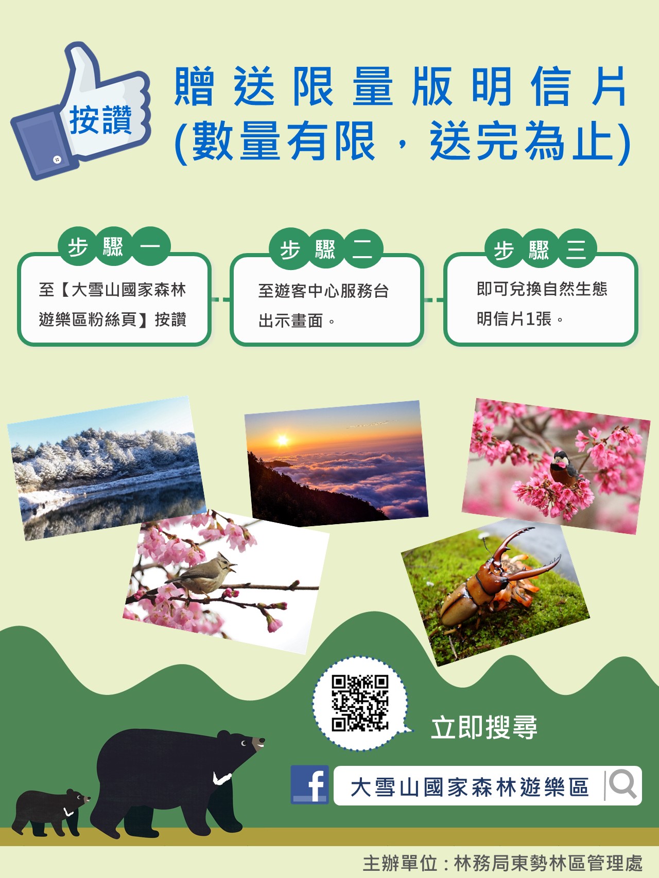 大雪山國家森林遊樂區春天氣息正濃,35K收費站山櫻花綻放中,紅粉花朵映在翠綠森林中,靜心漫步林間,啁啾的鳥鳴聲在身邊繚繞,帶給您視覺、聽覺的饗宴,新春期間不妨到大雪山,享受山林的美好,讓平日繁忙的心靈休憩一下~ 春節開園時間 大雪山國家森林遊樂區每年除夕(2/11,星期四)為園區全年唯一公告之休園日,其餘時間皆開放不休息,歡迎大家前來大雪山走春。 FB按讚送明信片 過年初一至初五期間(2/12-2/16)至大雪山FB粉絲專頁按讚,就送森林遊樂區明信片!數量有限,請到43K遊客中心索取。 疫情期間管制措施1500人 考量新冠肺炎疫情期間,遊客能安心出遊,入園管制人數下修至1,500人。而入園人數達1,200人時,園區將開始透過如下管道進行預告:(1)大雪山林道5K、15K電子看板;(2)警廣電台(FM104.9),春節期間建議民眾可提早出遊,避開9:30-13:30之車潮高峰期。 大雪山是國際著名的賞鳥景點,春暖花開之際,形成鳥語花香的美景,區內有多條步道,可依個人體力做選擇,春節期間就帶一家大小上山走春吧! 相關訊息請洽大雪山森林遊樂區04-25877901,facebook粉絲專頁:http://www.facebook.com/Dasyueshan/。