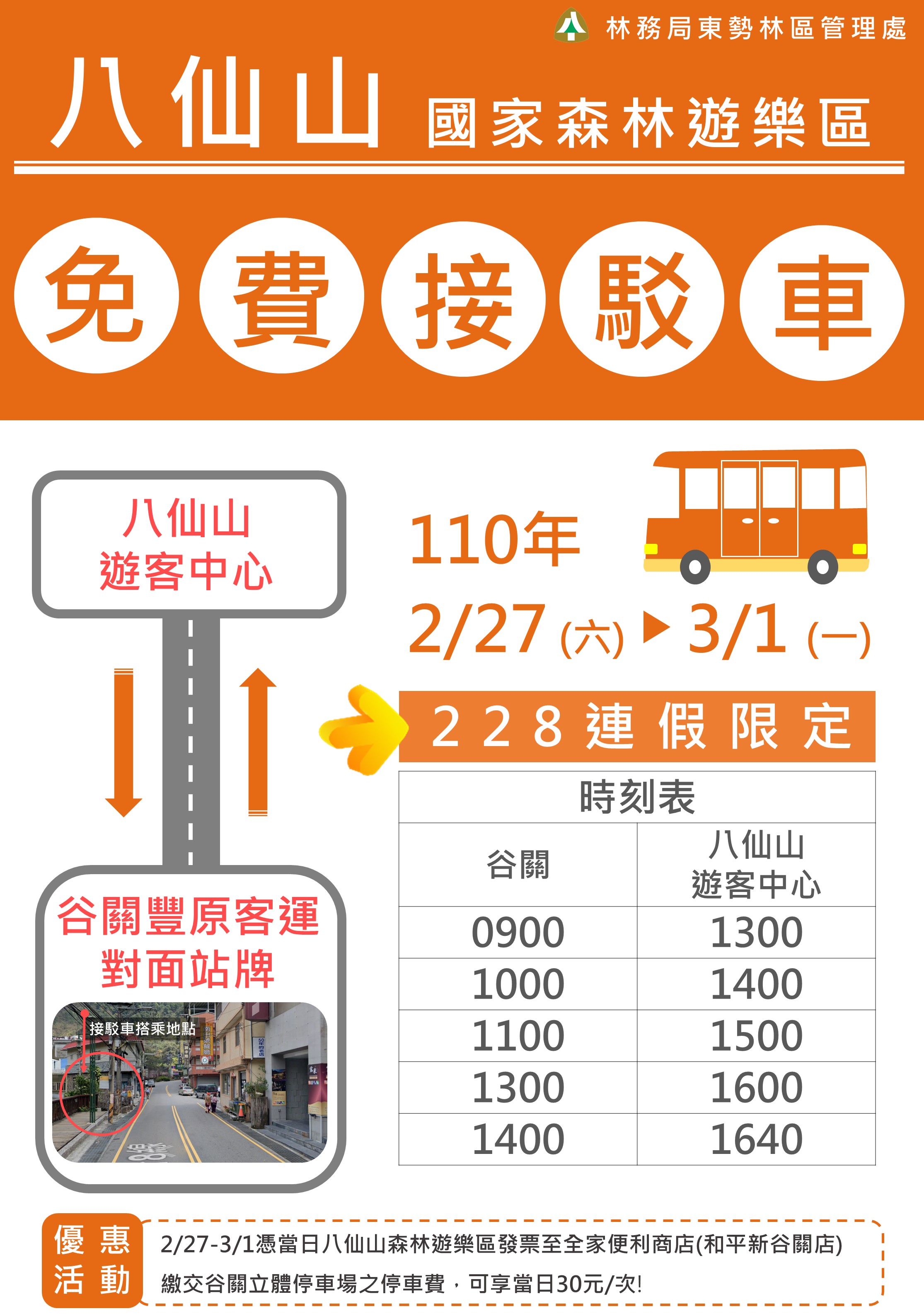 八仙山國家森林遊樂區正值櫻花盛放,仿佛鋪上了粉紅色絢麗的地毯,將碧綠的山頭抹上嫣紅,漫步在落櫻繽紛的步道讓森林裡的芬多精及負離子給您元氣滿滿,八仙山國家森林遊樂區是您中部最佳踏青景點,為因應遊客的需求,今年228連假提供免費接駁車。 八仙山國家森林遊樂區2月27日至3月1日早上九點至下午四點四十分提供免費接駁巴士,從豐原客運谷關站(明高溫泉養生會館對面)至八仙山收費站,遊客下車購票後即可搭乘園區內接駁車至八仙山遊客中心,凡持有八仙山國家森林遊樂區入園發票,可於谷關立體停車場旁全家便利商店繳費折抵20元停車費優惠,請遊客多多利用! 八仙山國家森林遊樂區正是春意盎然、鳥語花香的季節,歡迎闔家蒞臨,區內設有小木屋住宿及餐飲服務,訂房、餐請洽台中商旅八仙山莊:04-25950266。園區旅遊資訊請洽八仙山國家森林遊樂區遊客中心:04-25951214。