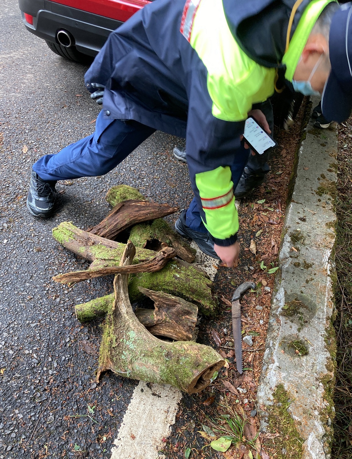 台灣山區森林資源豐富,時有山老鼠覬覦國有林地內之珍貴林木,近年,東勢林區管理處於所轄大雪山林道或步道旁發現多起樹根及倒木遭切鋸情事,立即責成森林護管員加強巡查。今(111)年年初,東勢林區管理處一名女性森林護管員,於巡視途中發現大雪山林道出現可疑人車,機警埋伏並連繫臺中市政府警察局和平分局雪山派出所,成功攔查一名呂姓男子,並於該男子駕駛之車輛後車廂起出6塊臺灣扁柏贓木及1支手鋸,人贓俱獲,依法送辦。 今年初,東勢林區管理處鞍馬山工作站一名女性森林護管員於巡視途中,發現大雪山林道有一可疑車輛,車內人員長時間逗留並假裝準備爬山用品,為降低男子警戒心,該護管員機警將公務車駛離現場,並徒步返回林道查看,發現人員已進入距林道400公尺處正進行切鋸作業,當下立即通報雪山派出所,並埋伏於林道轉角,待男子發車準備離開即進行通報,並由該轄區另一名巡視員會同雪山派出所員警於林道狹窄處成功攔查該車輛,於車內翻出6塊臺灣扁柏贓木及1支手鋸,人贓俱獲,贓木共重18公斤。全案已移送檢方偵辦。 東勢林區管理處表示,近來發現大雪山林道或步道旁部分樹根及倒木遭切鋸搬出,多屬小型竊取案件,雖或有民眾是因好奇心或為私人收藏而進行切鋸,然而無論砍伐數量之多寡,只要鋸切生立木樹瘤、樹根及砍伐、盜挖生立木植株等,都會危害自然生態與珍貴景觀資源,皆屬盜伐犯罪行為,若竊取紅檜、臺灣扁柏及牛樟等貴重木,更可加重其刑至二分之一。 東勢林區管理處強調,盜伐熱點除由森林護管員加強巡視,亦於林間裝設紅外線照相機進行監測,請勿心存僥倖,台灣山林資源豐富,呼籲民眾共同守護,若發現疑似盜伐行為,可以撥打保林專線0800-000930,也可以搜尋LINE官方帳號「山老鼠雷達站」,加入並通報,共同保護臺灣美麗山林。
