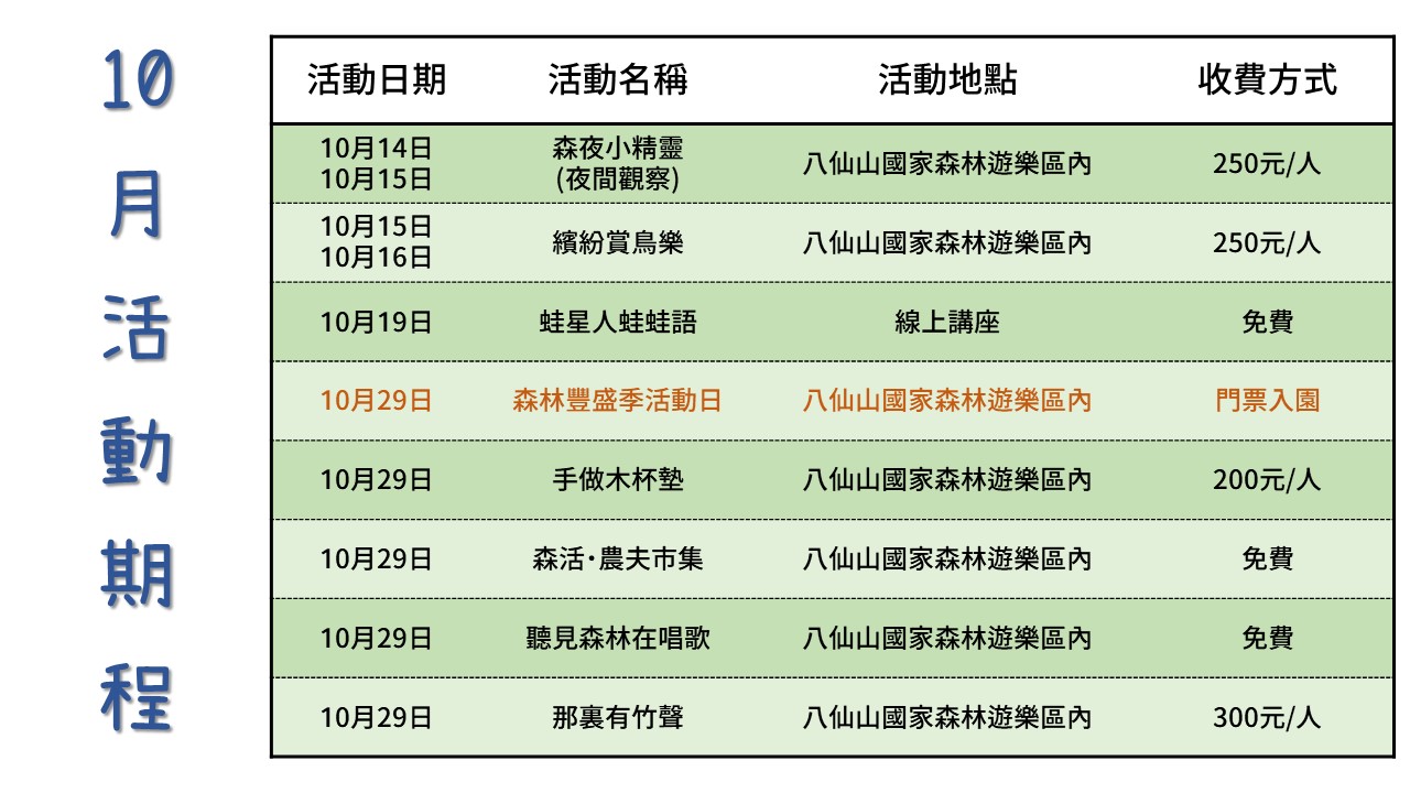 一年一度的八仙山豐盛季即將來臨!林務局東勢林區管理處轄下八仙山自然教育中心,為邀請民眾踏入森林環境,感受大自然的美好,探索隱藏在大自然中的豐富樂音!今年八仙山森林豐盛季以「森音樂園」為主題,10月14日起至10月29日止,為展現在地特色資源與文化之內涵,週週皆有系列活動,讓您10月份暢遊八仙山森音樂園! 這次系列活動以「森林裡的聲音」為題,引導民眾認識森林裡的各式聲音,活動包含「森夜小精靈」夜間觀察,帶領學員聆聽夜晚八仙山森林的聲音,並尋找野生動物的蹤跡;秋季也能享有「繽紛賞鳥樂」,學習透過雙筒望遠鏡觀察八仙山繽紛的鳥羽,聆聽悅耳清脆的鳥鳴聲;夜晚「蛙星人的蛙蛙語」也是一絕,這場免費線上講座邀請中興大學生命科學系莊銘豐老師,介紹臺灣豐富的蛙類生態及蛙類世界的互動小秘密,為大家解密蛙鳴聲的意涵。 八仙山豐盛季的重頭戲在10月29日登場,開幕式邀請「鼓動樂音」太鼓表演,為山林敲出八仙山樂章的第一聲,當天有免費步道闖關活動「聽見森林在唱歌」、具在地特色之「森活‧農夫集市」,也有多項精彩課程供現場報名參與,例如國產材DIY「手作木杯墊」課程(優惠價200元/人)、泰雅原民竹藝文化「那裡有竹聲」之體驗課程(優惠價300元/人),凡參加八仙山森林豐盛季任一活動,即可參與神秘禮品抽獎活動。 上述系列活動皆須事先報名,名額有限,額滿為止!詳細資訊請至「台灣山林悠遊網」搜尋「八仙山自然教育中心」找到報名頁面與活動簡章。歡迎大家在秋天這個豐收的季節,一起到八仙山聆聽自然的美音,在豐富的活動中,享受森林帶來多元的體驗。