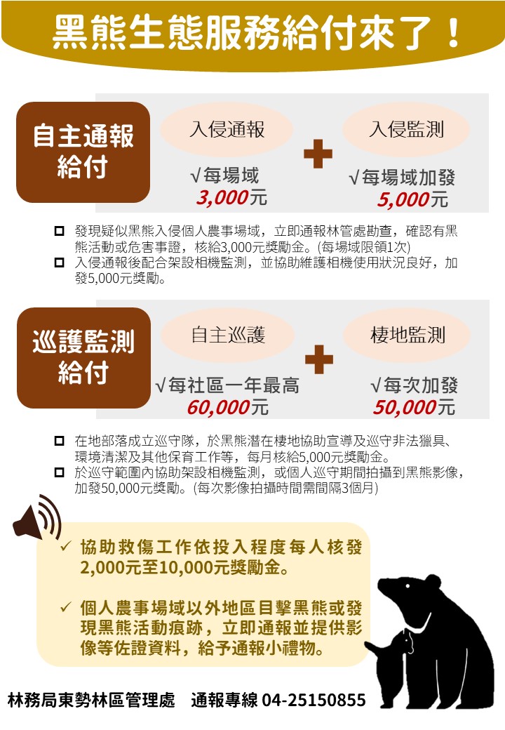 東勢林區管理處自今(111)年11月起,啟動臺灣黑熊生態服務給付示範計畫,如有黑熊入侵個人農事場域,主動通報可領取獎勵金,並邀請社區居民自主巡守,加入守護黑熊棲地的行列;另外,山村居民如有發生誤捕黑熊情形,也請立即通報,不僅可以免於究責,如果協助參與救援行動更有機會獲得最高1萬元獎勵金。 東勢林區管理處表示,雪山山脈是臺灣黑熊在北臺灣的重要分布範圍,大雪山國家森林遊樂區近幾個月數度拍攝到黑熊身影,照片內的黑熊看起來毛髮茂密黑亮、體態健康,根據該處過去所蒐集的資料顯示,每年隨著季節變動,黑熊容易會有往山村部落移動的情形,該處提醒民眾,大雪山國家森林遊樂區周邊雪山坑溪、谷關地區等地,近年來常有目擊黑熊的紀錄,為了讓山村居民更瞭解遇到黑熊該如何因應,該處除由各工作站主動至部落宣導遇熊通報外,同時也委請野聲生態顧問有限公司團隊,針對大安、麻必浩、桃山、雪山坑等過去黑熊通報案件紀錄較多的社區辦理說明會,向山村居民宣導遇到疑似黑熊入侵案件時,立即通報由該處提供協助,並鼓勵居民透過自主巡守,建立友善黑熊社區。 東勢林區管理處進一步說明,透過農委會推動「臺灣黑熊生態服務給付示範計畫」,該處以和平區做為示範區域,分別提供自主通報和巡護監測兩種給付項目,山村居民如在個人農事場域內發現有黑熊入侵情形,完成通報並經勘查確認是黑熊活動或危害,就符合自主通報給付條件,可領取3千元獎勵金,如配合於通報場域架設自動相機監測,加發5千元獎勵金;另外也鼓勵山村居民加入黑熊棲地巡護行列,輔導在地居民成立自主巡守隊,在黑熊潛在棲地協助進行環境維護、非法獵具巡查及通報,以及黑熊保育宣導等工作,每年最高可領6萬元巡護監測給付,如在巡守區域拍攝到黑熊活動影像,再加發5萬元獎勵金。山村居民如有發生誤捕黑熊,只要立即通報就可以免於究責,協助救援依投入程度不同,還可以獲得2千元至1萬元獎勵金。 東勢林區管理處提醒,民眾進入山區活動,請隨身攜帶熊鈴,減少與熊發生不期而遇的機會,如在野外地區與黑熊相遇,請記得不驚嚇不打擾,緩步離開,多數黑熊遇到人會自動閃避;山村居民於果園內外不放置飼料、食物或亂丟棄果,避免吸引黑熊或其他野生動物靠近,如果有發現黑熊活動蹤跡、入侵農事場域、受傷或誤捕黑熊等情形,請加入自主通報系統,主動撥打1999或東勢林區管理處通報電話(04-25150855),除了有專業人員提供協助外,也可獲得獎勵金,讓人與熊維持良好的理性互動,營造與黑熊和諧共處森林環境。