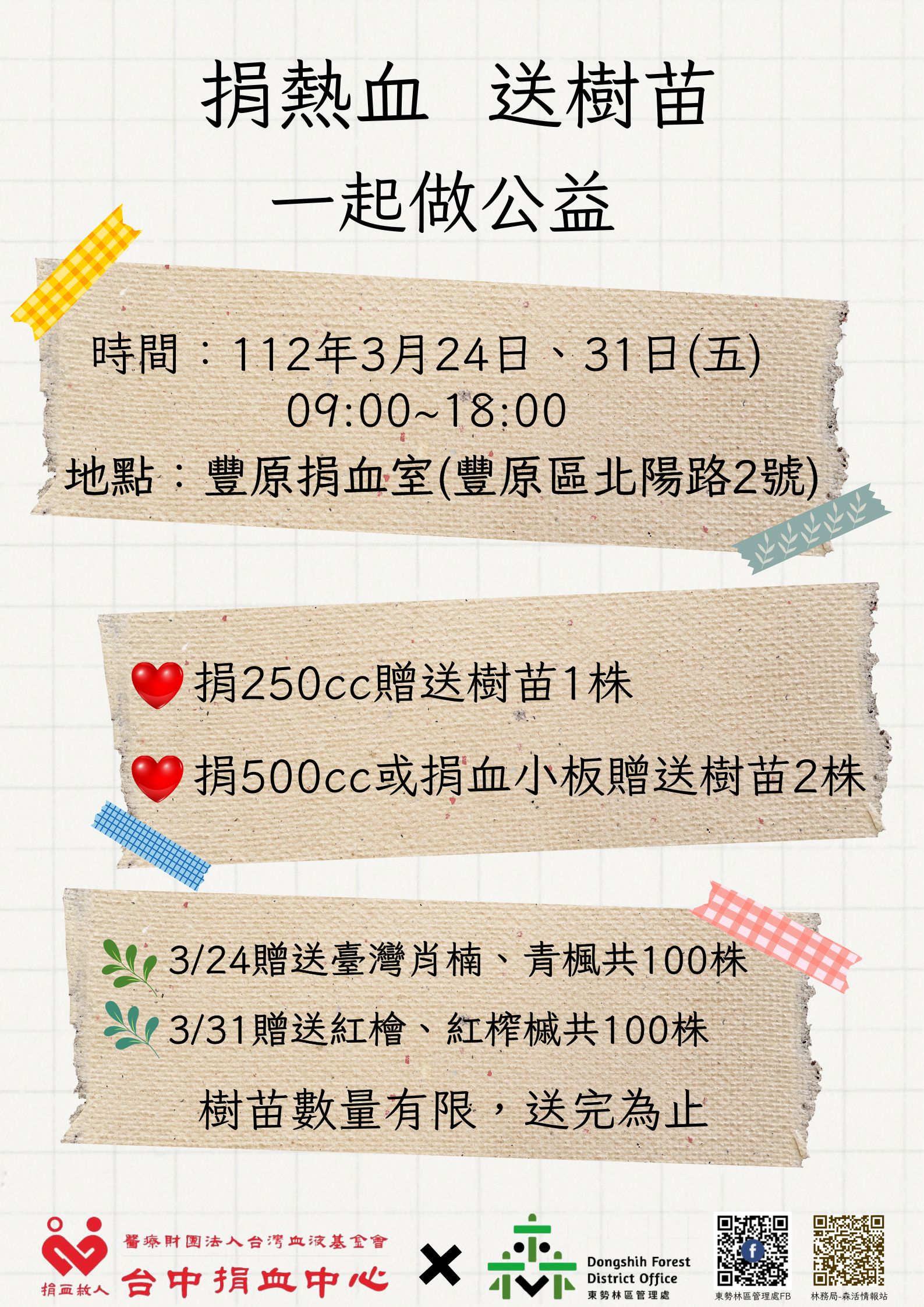 東勢林區管理處今(112)年首次與台中捐血中心合作,將於3月24及31日(周五)上午9時至下午6時,在豐原捐血室提供共200株樹苗贈送捐血民眾,捐血250cc贈送樹苗1株,捐血500cc或捐血小板贈送樹苗2株,贈完為止,歡迎民眾捲起袖子一起捐熱血、做公益、領樹苗,幫助他人也愛護環境。 東勢處表示,隨著COVID-19疫情逐漸緩解,為鼓勵民眾多多出門捐血,該處提供臺灣肖楠、紅檜等針一級貴重木及青楓、紅榨槭等賞葉樹種共200株樹苗,民眾到豐原捐血室捐血,就能領到原生種樹苗,做公益也綠美化環境,營造優質森活圈。 東勢處同仁愛心不落人後,也挽起袖子踴躍參與捐血活動,以行動力支持捐血救人,期待能夠鼓勵更多民眾一起將愛心散布出去,送出樹苗讓民眾綠化環境、固碳護地球,一舉數得。 為響應減塑政策,樹苗採用可生物分解的環保苗盆盛裝,民眾領取樹苗後,可直接將苗盆連同土球種植到土裡,無需脫盆,更方便也更環保,並提醒民眾自行攜帶環保袋裝樹苗,共同落實減塑新生活,另外提醒民眾,紅檜及紅榨槭適合天氣較涼爽的中海拔地區生長,建議以適地適木方式栽植。