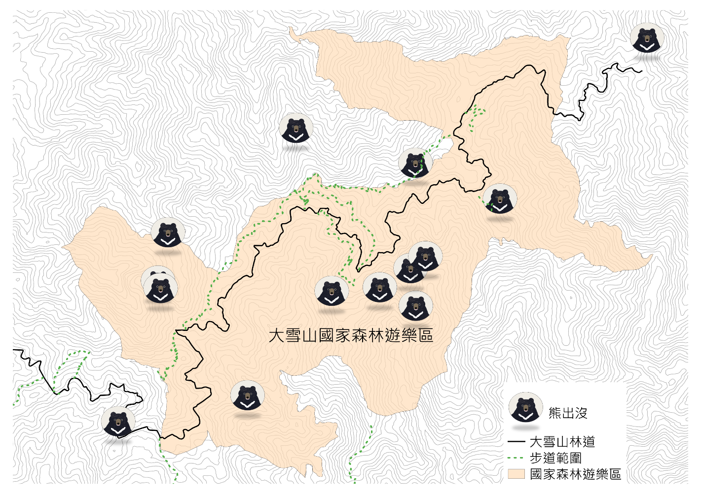 去(111)年5月,編號711/568的東卯山黑熊,在兩度受困陷阱後的第二次野放,從野放地點南投丹大林區一路向北,翻越一座座高山與河谷,就在林業及自然保育署臺中分署(原林務局東勢林區管理處)野放團隊意識到牠可能是想要回到原棲地大雪山,而準備進行全民護送711/568回家的行動時,卻在武界山區遇害,林業保育署臺中分署在今年初,除了將711/568的遺體送回大雪山讓牠回家,今天也在大雪山國家森林遊樂區完成了一處名為「我和你的世界相連」裝置藝術,讓來到大雪山的遊客與有熊世界相連。 林業保育署臺中分署表示,大雪山國家森林遊樂區是臺灣黑熊的重要棲息環境,也是711/568黑熊的原棲地,為了向遊客傳達有(友)熊森林的理念,同時呈現711/568歷經國內首次異地野放,最後長眠於大雪山的生命故事,特別邀請原住民藝術家黃林育麟,以泰雅族起源文化生命與自然界的連結為發想,運用臺灣黃藤纏繞連接石洞,打造「我和你的世界相連」藝術作品,作品中以藤材編織月形椅象徵月熊(臺灣黑熊),周圍地面鋪上刻印各種野生動物腳印的石板,來述說自然環境與萬物生命間的相連,表達著過去、現在、未來,萬物生命的相生相息。藝術創作置於大雪山國家森林遊樂區35K入口處,遊客在進入園區時,第一眼即可感受到有熊森林追求人熊和平共處的真諦。 林業保育署臺中分署說明,該分署在大雪山國家森林遊樂區及周邊山域,長期架設紅外線自動相機進行中大型哺乳動物監測,在所架設的18台自動相機中,就有13台相機曾記錄到黑熊身影,稱為有熊森林當之無愧。 該分署強調,包括大雪山國家森林遊樂區與周邊的谷關七雄山域都是有熊森林,在711/568遇害之後,更致力將該區域營造為友熊森林。因而呼籲遊客與山友,在感受這片靜謐獨特的有熊森林同時,也請留意步道設置的熊出沒告示,隨身攜帶熊鈴,減少與熊不期而遇。倘巧遇黑熊,不驚嚇不打擾,緩步離開,多數黑熊遇到人會自動閃避,並請民眾登山時遵守「無痕山林」準則,將垃圾及廚餘帶下山,避免野生動物受到人類食物吸引;山村居民於果園內外不放置飼料、食物或亂丟棄果,避免吸引黑熊或其他野生動物靠近,如有發生誤捕或誤傷黑熊事件,請立即通報(臺中分署:04-25150855,林業保育署24小時通報專線:0800-000-930),讓人熊及其他野生動物和諧共好。
