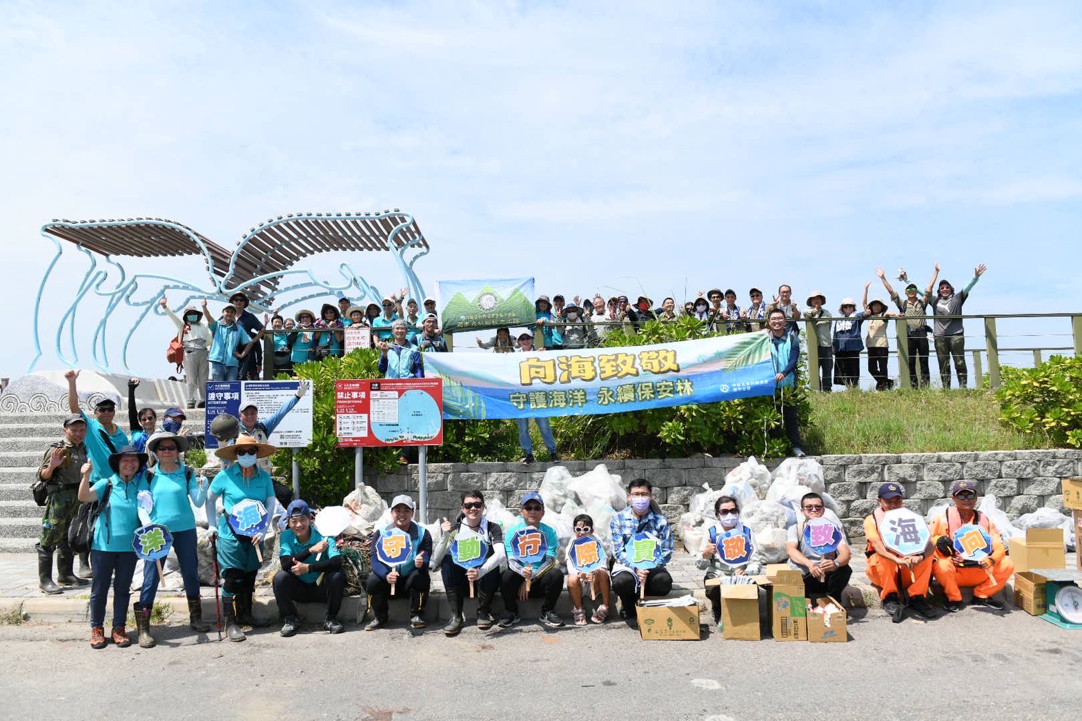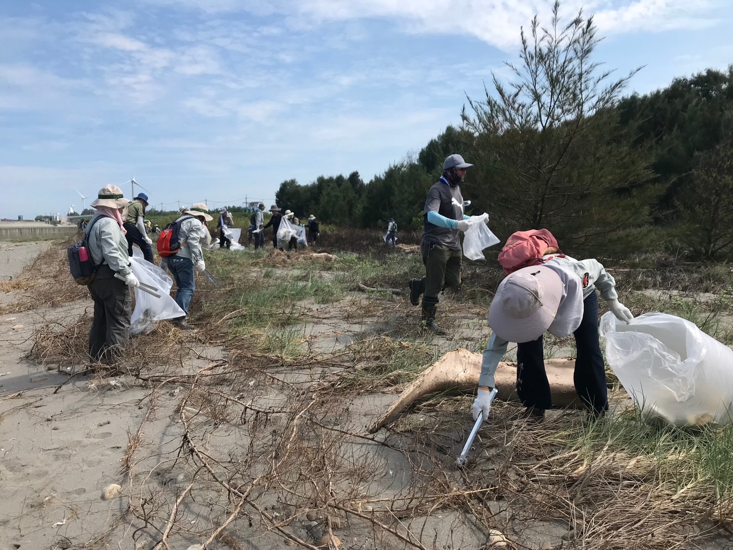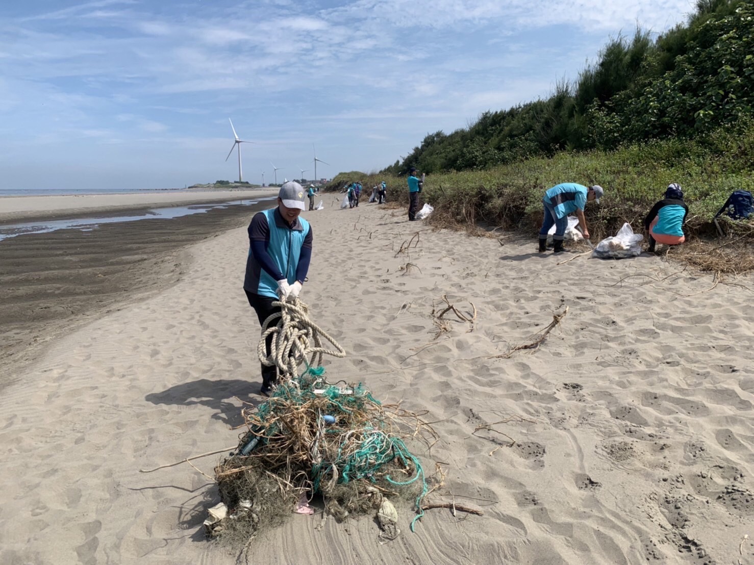 為響應「國際淨灘日」及行政院「向海致敬」政策,林業及自然保育署國家森林志工以實際行動維護海洋環境生態,各地區分署同步在國際淨灘日(每年9月第3個周六)辦理向海致敬淨灘活動,林業及自然保育署臺中分署攜手南投分署,號召100人挽袖走入大安紅樹林生態步道旁的第1427號保安林,撿拾清除陸海域廢棄物計390公斤,共同守護台中市海岸及保安林潔淨的環境。 林業保育署臺中分署今(16)日在位於台中市大安區第1427號防風保安林舉辦淨灘活動,更號召南投分署國家森林志工一起清理隨著海浪拍打到沙灘及保安林內的海漂垃圾,志工伙伴們穿梭在保安林林下及帶刺的濱刺麥叢裡,彎著腰清理出寶特瓶、塑膠碗、手搖飲杯、啤酒罐、洗衣精瓶等生活居家常見垃圾,深刻感受到在生活中,只要不使用一次性用具、謹慎處理垃圾,就可以從源頭減量,減少對環境造成衝擊。 臺中分署表示,鄰近海岸邊的保安林,具有防風及防砂功能,能保護保安林內部住家及耕地不受海風侵害,近期接連而來的颱風及豪雨,將海洋中垃圾大量捲到沙灘上,有生長良好的保安林將垃圾阻擋留滯在林緣邊,有效減少住家及耕地遭受危害。 此次淨灘活動由林業及自然保育署國家森林志工發起,於全臺灣北、中、南、東四處海岸保安林同步辦理「向海致敬-實際行動守護海洋」活動,除發揮志願服務的精神,更希望透過活動喚起民眾對生活周遭保安林及海岸環境的維護意識,瞭解海洋廢棄物的議題及垃圾減量的觀念,進而以實際行動守護海洋,打造乾淨又美麗的海岸線,以永續保安林的環境生態。
