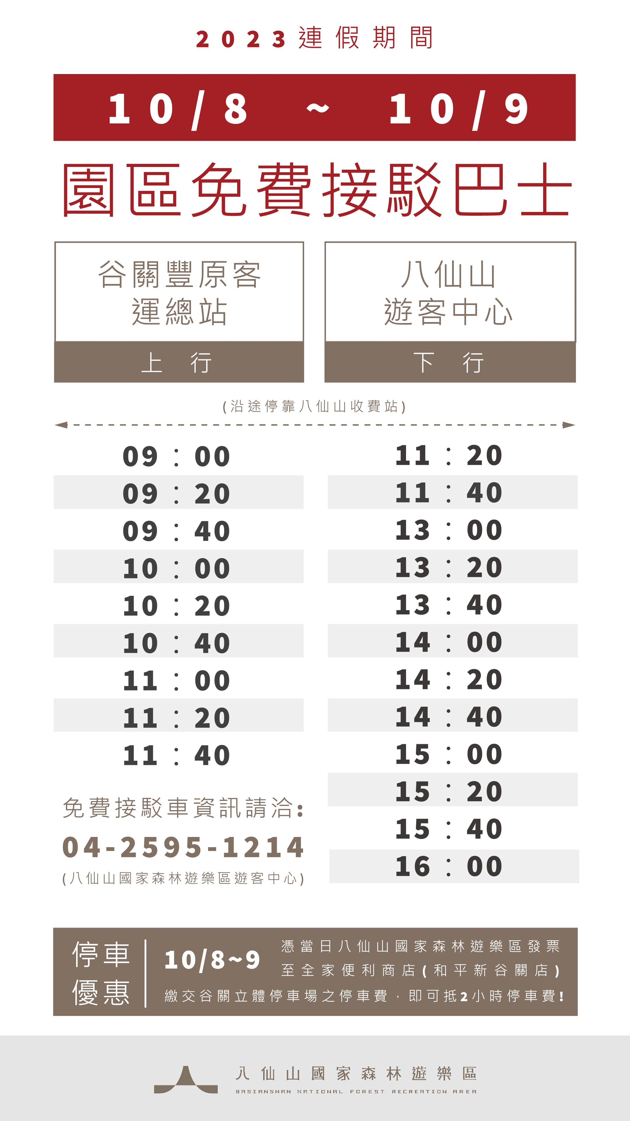為舒緩雙十連假車潮,八仙山國家森林遊樂區於10月8日至9日提供谷關至園區之免費接駁車,從豐原客運谷關站搭車至八仙山收費站,下車購票後直接抵達八仙山遊客中心,持入園發票可享停車費優惠,於谷關立體停車場旁全家便利商店繳費折抵當日2小時停車費,請遊客多加利用。