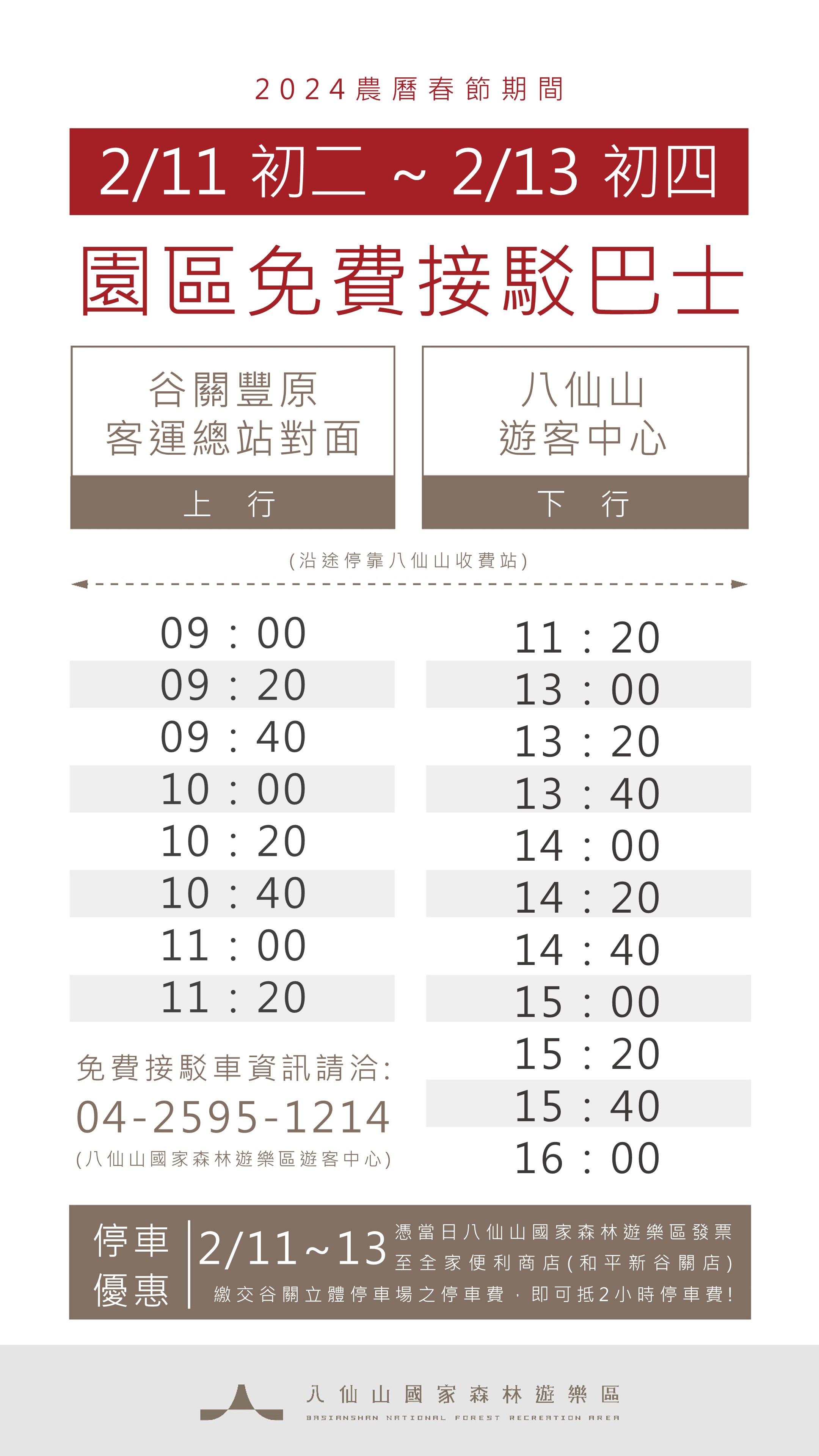 為迎接2024農曆春節七天連假,林業及自然保育署臺中分署特別整理所轄森林育樂場域的休園時間、接駁服務、車流管制、好玩好買的旅遊資訊,提供完整的春節旅遊攻略,讓民眾在連假期間玩得自在又fun心。 該分署所轄八仙山、大雪山、武陵國家森林遊樂區及東勢林業文化園區,是中部地區最佳享受的旅遊景點,春節期間大雪山及八仙山國家森林遊樂區除夕(2月10日)休園,東勢林業文化園區除夕及初一休園外,其餘時間皆正常營運,邀請民眾到森林遊樂區踏青放鬆,迎接春意盎然的新年! 林業保育署臺中分署表示,大雪山國家森林遊樂區43k遊客中心販賣部於初一(2/10)起試營運,現場將販售大雪山獨賣款蕨類抱枕及黃喉貂等原創商品。八仙山國家森林遊樂區內山櫻花正盛放,初一到初五(2/10-2/14),遊客與園區櫻花景點拍照並於臉書上傳打卡,即可獲得八仙山限定紅包袋,將新春好運龍給你!武陵國家森林遊樂區春節期間逢武陵農場櫻花季(時間為113年2月8日至113年2月29日止共22天),櫻花季期間實施交通管制,請民眾提早規劃及關注武陵農場官方資訊。東勢林業文化園區目前有「《入境山林》探索森林島嶼」特展,展出期限至2月25日,民眾可多利用難得的假期前往。 為了讓遊客可輕鬆走春,八仙山國家森林遊樂區初二至初四(2/11-2/13)提供免費接駁車,從豐原客運谷關總站對面到八仙山遊客中心,定時提供免費公車接駁服務。自行開車的朋友可將車停在谷關立體停車場,回程憑入園發票至谷關立體停車場旁全家便利商店繳費,即可折抵停車2小時。目前該分署與谷關全家便利商店策略聯盟合作,於全家商店內展示園區特色商品,部分商品到谷關遊客中心的賣店也能購買,歡迎民眾前往選購。 八仙山、大雪山、武陵國家森林遊樂區及東勢林業文化園區是春節期間,闔家出遊、登山、森林浴、賞鳥和生態休憩的好去處!相關旅遊資訊,請洽大雪山遊客中心(04)25877901、八仙山遊客中心(04)25951214、武陵山莊(04)25901020及東勢林業文化園區(04)25774146詢問,或至各場域官方臉書、台灣山林悠遊網:查詢。