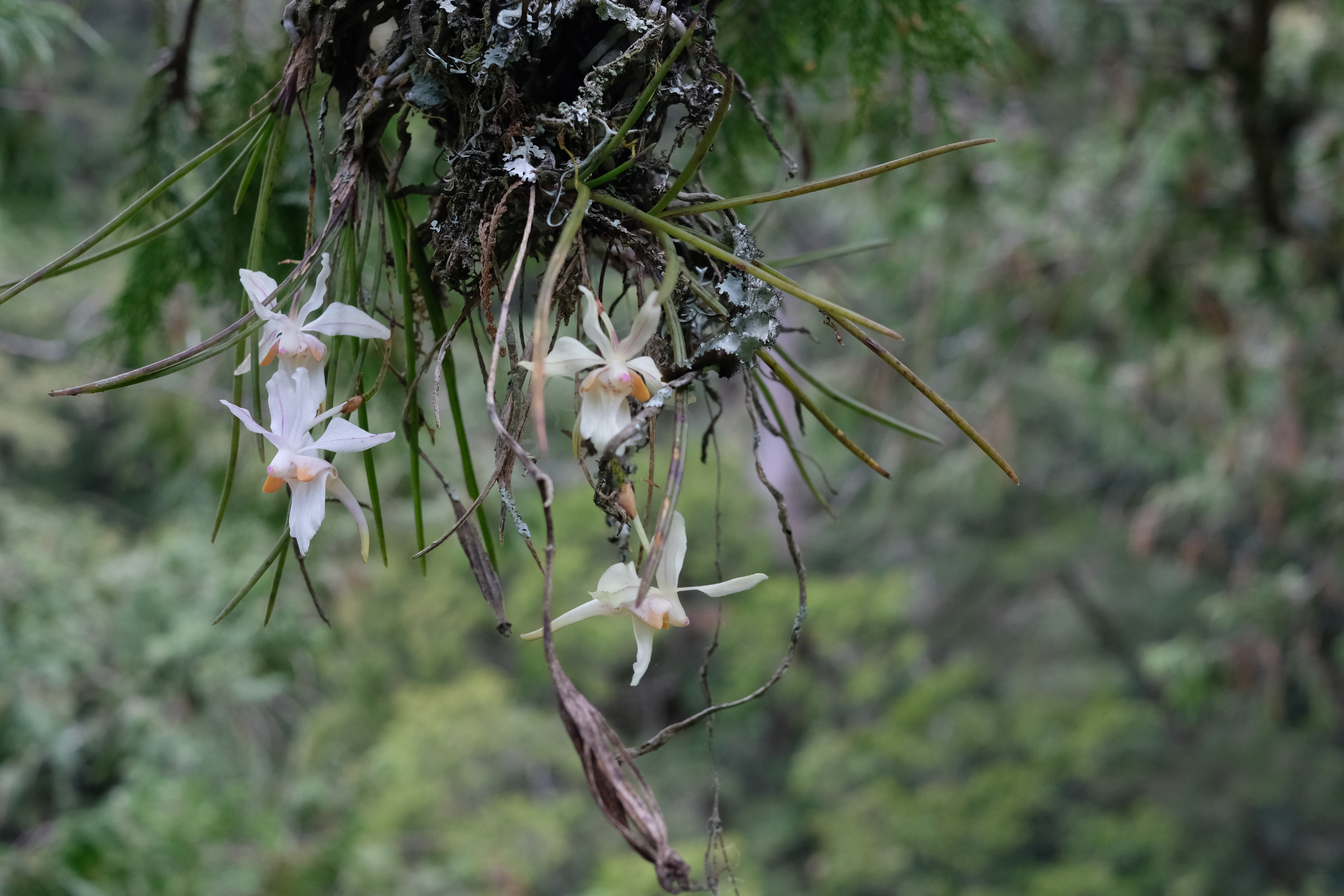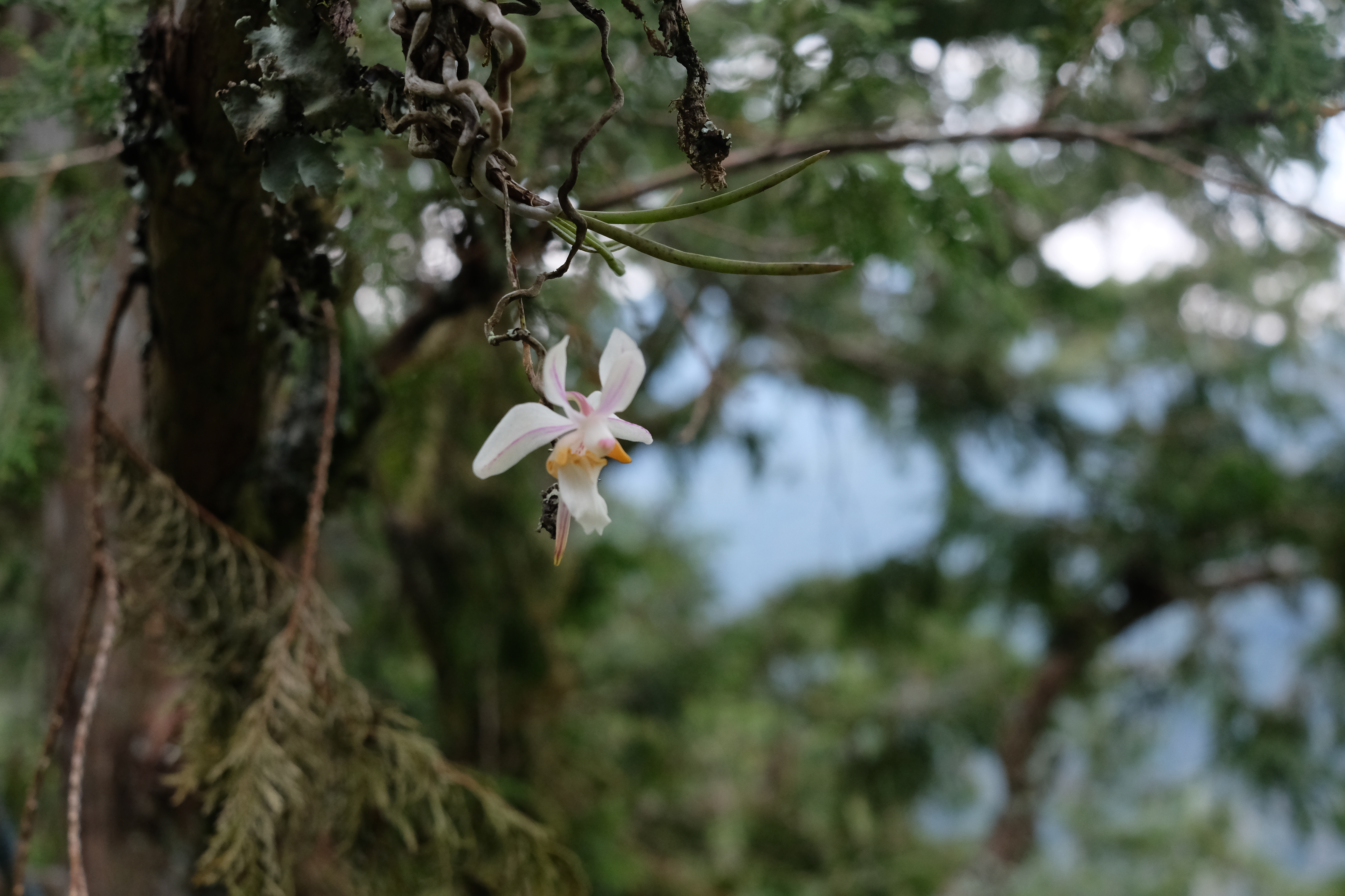 林業及自然保育署臺中分署所轄的大雪山國家森林遊樂區植物資源豐富,位屬中高海拔霧林帶,豐沛的水氣造就了豐富的附生植物世界,為了要記錄樹冠層上的生態與植物,森林護管員攀升至40公尺高度,透過攀樹的方式揭開紅檜巨木樹冠層上的面紗,意外發現保育等級的瀕危物種,臺灣原生的中小型蘭花--撬唇蘭,令參與調查的工作同仁都驚喜不已。 撬唇蘭為臺灣原生蘭花,花色為白色略帶粉紅斑,花徑約3到4公分,屬於國際自然保護聯盟(The International Union for Conservation of Nature ,IUCN)保育等級的瀕危物種,生長於臺灣中高海拔山區1500~2200公尺,花期為春季,潔白無瑕的美麗身影令人難忘。 大雪山國家森林遊樂區位於海拔1800-2996公尺之間,其中1800-2500公尺的高度也被稱為霧林帶,森林浴步道中優美的檜木林相是到訪遊客最愛的景點。這次調查的紅檜樹高約50公尺,就像一棵大樹公寓一樣,是許多生物的棲地。這次工作同仁使用攀樹裝備攀升至40公尺樹冠層上時,調查記錄到許多附生植物,像是撬唇蘭、豆蘭屬植物、書帶蕨屬植物、瓦葦屬植物等,除此之外,同時也記錄到飛鼠的排遺以及樹幹上飛鼠的窩,窩裡面鋪滿了紅檜的枝葉,工作人員直呼這也太香了,樹上的世界真是精彩、熱鬧萬分。 林業保育署臺中分署表示,大家平時在森林浴步道中,礙於高度及視野,無法看到樹冠層的豐富生態,這次透過森林護管員攀樹觀察紀錄,讓大家可以用不同的空間尺度看到紅檜巨木樹上的植物世界。這些資料也呈現在大雪山遊客中心三樓的植物世界展示室,歡迎大家可以近距離觀賞這難得的畫面。該分署也呼籲,附生植物因為沒有穩固的根系,容易受到自然或人為的擾動而掉落地面,所以請大家在觀察的時候,記得不要用手去採摘,讓這些附生植物好好生存在山林中,我們才有美麗的森林。