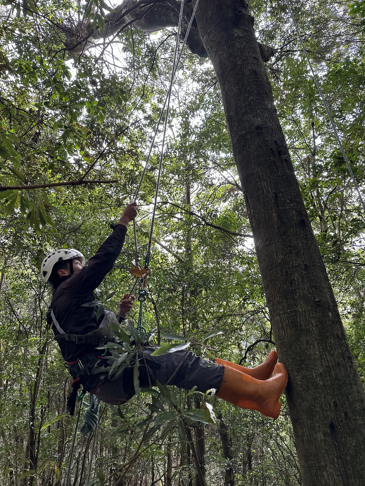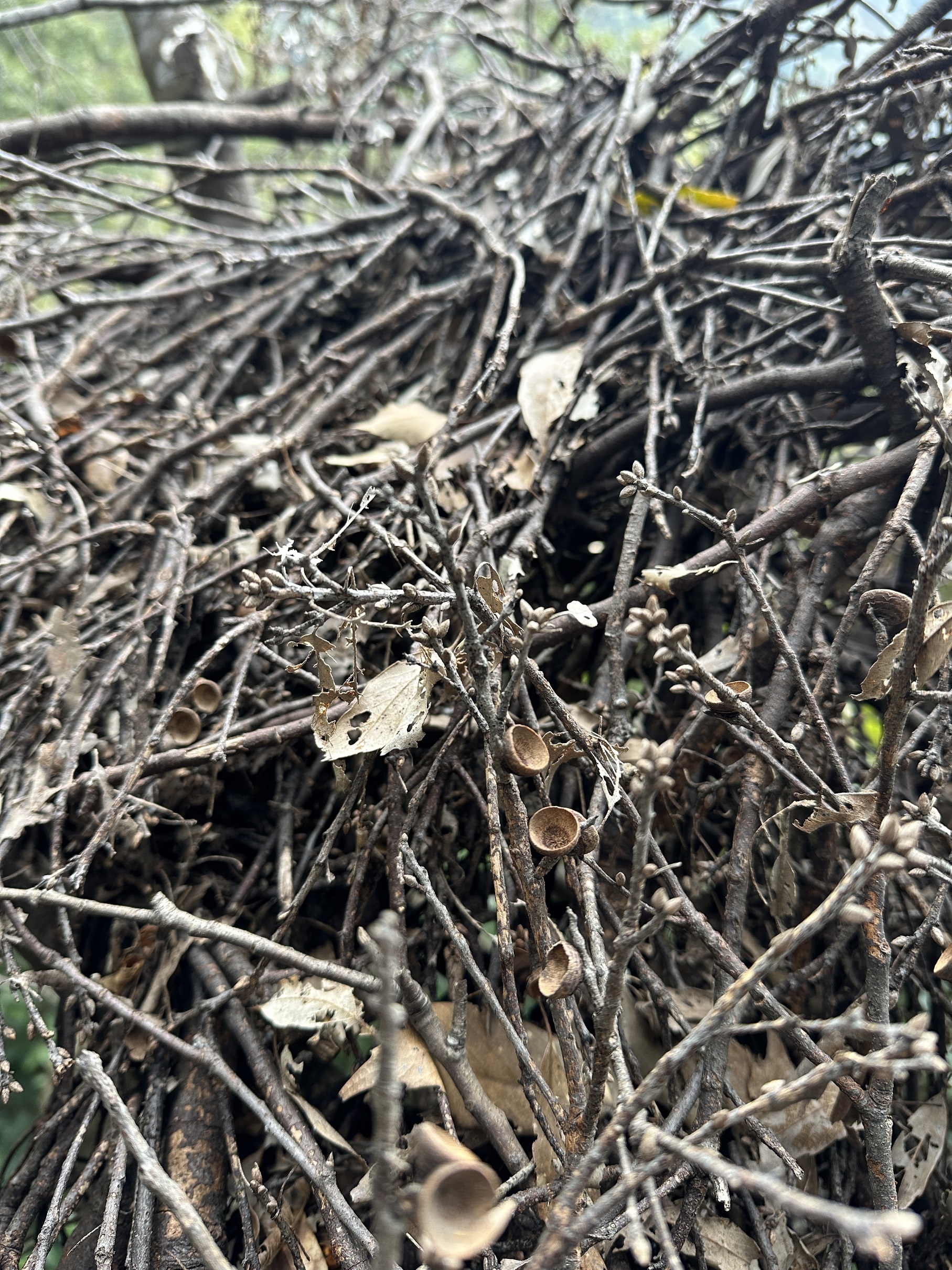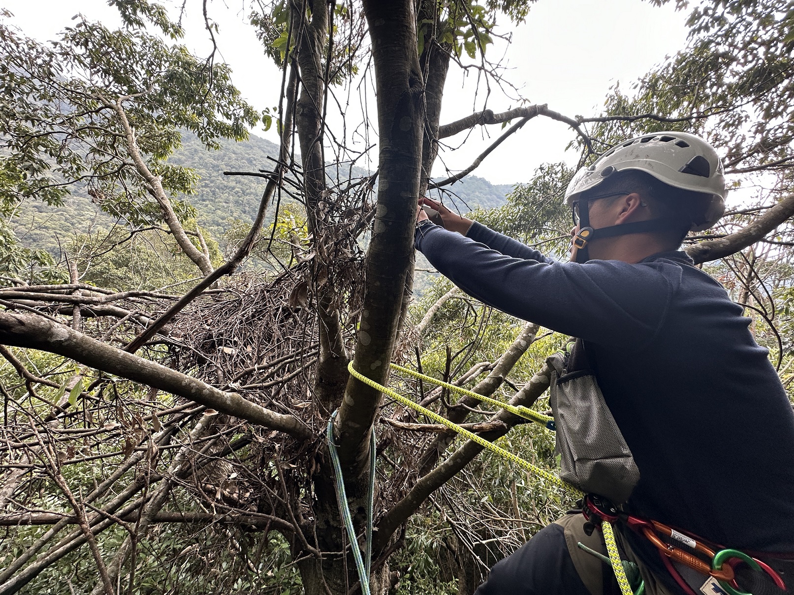 大雪山地區是臺灣黑熊活動及生存的重要棲地,近日林業及自然保育署臺中分署進行自主研究監測時,於一棵青剛櫟樹上發現疑似臺灣黑熊的熊窩,該分署森林護管員透過攀樹方式查看,驚喜發現原來樹上共有4個直徑約80~110公分,大小不一的熊窩,讓參與監測作業的工作人員都感到十分興奮。 為瞭解大雪山地區臺灣黑熊棲地利用及活動情形,林業保育署臺中分署在黑熊可能的移動路徑及活動地點,規劃紅外線自動相機監測,希望能捕捉到珍貴的黑熊畫面,同時於巡護的路徑觀察是否有樹上的熊爪痕、黑熊排遺等黑熊活動的痕跡。近日該分署森林護管員於進行紅外線相機維護工作時,在路徑上發現三處熊爪痕,並在其中一棵有熊爪痕的青剛櫟樹上發現疑似熊窩,透過森林護管員使用攀樹裝備攀爬至25公尺高的樹上查看,發現樹上共有4個大小不一,以青剛櫟枝條編織而成的臺灣黑熊熊窩。 林業保育署臺中分署表示,臺灣黑熊編織巢窩是天性,牠們的手掌像人類一樣能彎曲的前肢,可以折下樹枝築成熊窩,有時也會直接在樹上築窩。這次進行研究監測時發現的熊窩,周邊也有被折斷的樹枝枝條,在窩裡面還可看到青剛櫟果實的櫟帽。由現場情況推測,不排除黑熊為取食方便而在樹上不同位置築窩的可能性。 林業保育署臺中分署提醒,大雪山國家森林遊樂區及谷關七雄周邊山域都是黑熊活動的範圍,民眾於山林活動請隨身攜帶熊鈴,遵守無痕山林準則,如在野外巧遇臺灣黑熊,記得不驚嚇、不打擾,緩步離開,並於安全處向該分署通報(通報電話:04-25150855),提供黑熊出沒訊息資料作為保育研究使用,也讓人與熊和平共享山林。
