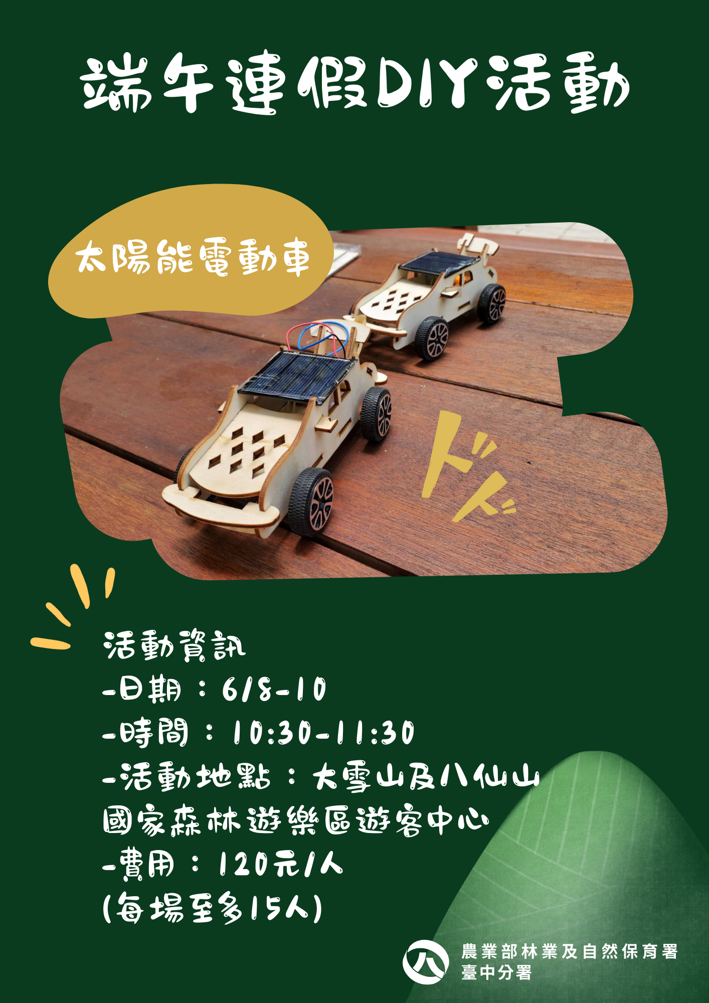 端午節除了吃粽子、掛艾草招好運去霉運,林業及自然保育署臺中分署推薦大家到所轄大雪山及八仙山國家森林遊樂區充電,端午連假三天也特別推出太陽能小車DIY活動,希望大家與太陽能小車一同曬曬太陽,吸收午時正能量,端午節當天應景再加碼立蛋活動,充實佳節時光。