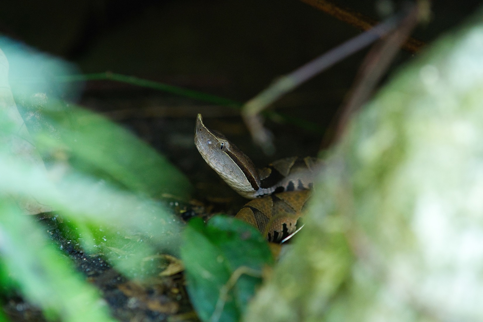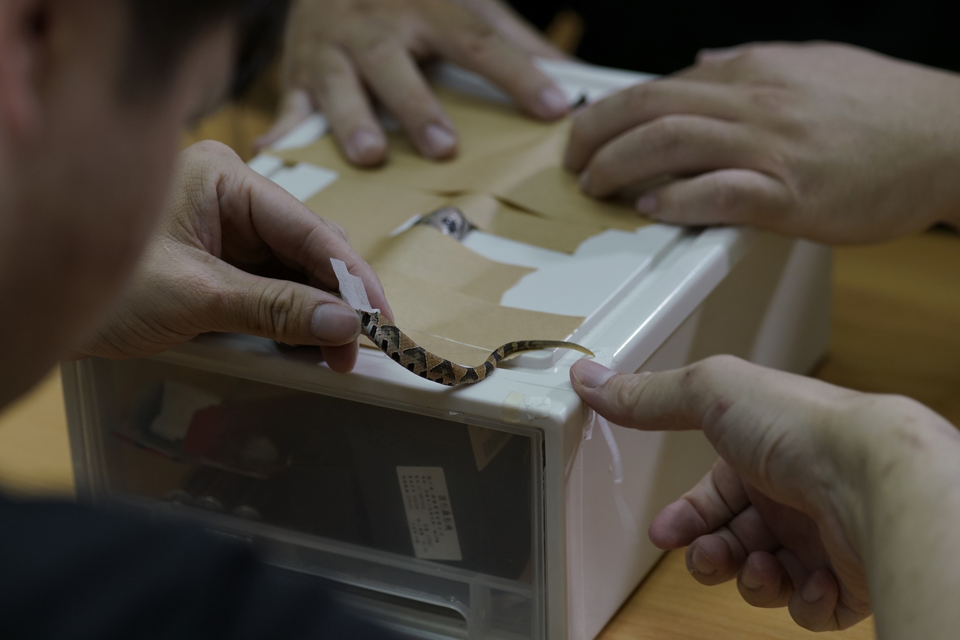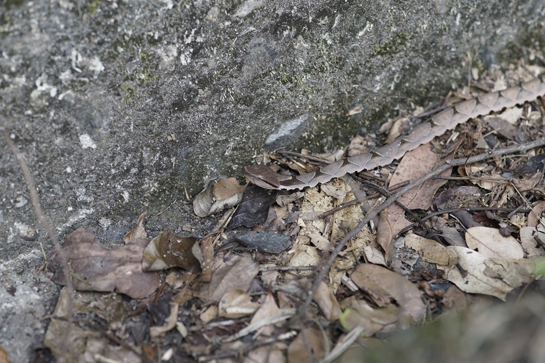 林業及自然保育署臺中分署去(113)年6月發布「守護:百步蛇野外護卵孵化記錄」影片,記錄八仙山國家森林遊樂區內全球首筆野生百步蛇護卵、孵化及護幼過程,獲得廣大迴響。就在幼蛇孵化後1年,該分署又於園區內發現百步蛇幼蛇身影,經比對確認是影片內記錄到母蛇所產下的幼蛇之一,立即把握珍貴的機緣,再次對幼蛇進行追蹤,並透過形質測量發現,幼蛇體長從27.99公分增長為34.58公分,體重也從16.65公克增加至23.14公克,累積更多百步蛇野外生態資料,趁著迎接蛇年到來時,公開寶貴資料與民眾一同分享。 林業保育署臺中分署表示,國家森林解說志工陳科綬老師於八仙山國家森林遊樂區進行鳥類調查期間發現一條百步蛇幼蛇,該分署接獲消息立即派員至現場巡視,發現幼蛇出沒位置僅距離母蛇護卵洞穴227公尺,透過蛇體花紋比對後,驚喜發現正是影片內記錄過追蹤時間長達38日的幼蛇,是當時孵化後追蹤時間最久的個體。在幼蛇孵化滿周年時,看到幼蛇在野外環境中健康成長,也讓參與百步蛇護卵、孵化及護幼記錄追蹤的工作同仁為之振奮。 林業保育署臺中分署指出,能再度記錄到百步蛇幼蛇離巢1年後的野外生態資料十分難得且彌足珍貴,這次同樣透過不影響幼蛇活動的諧波反射器進行追蹤,直到幼蛇完成蛻皮,並成功將黏附幼蛇體表的追蹤器取回,共累計17日的追蹤資料,結果發現幼蛇大多時間會停棲在岩縫地形內,也會透過周邊蕨類間隙環境進行溫度調節。另外,研究人員在追蹤的過程中,在附近也發現另外1條百步蛇幼蛇,經花紋比對確認為同一批孵化的幼蛇,顯示母蛇繁殖地點的選擇,除了考量護卵過程所需的環境以外,同時會選擇適合幼蛇離巢後利用的棲地環境,這些發現為野外百步蛇生態研究展開新的里程碑。 八仙山國家森林遊樂區自然資源豐富且多元,是許多蛇類的棲地,林業保育署臺中分署將針對步道周邊環境加強巡視,同時提醒民眾山野活動時,避免雙腳肢體外露,或伸手進入看不見內部的枯木樹枝堆及石頭隙縫,臺灣的蛇類不會主動攻擊人,如遇到蛇不要試圖攻擊、捕捉,安靜離開或待蛇自行離開即可,一起與園區內的野生動物和諧共處。該分署在八仙山國家森林遊樂區遊客中心推出「百步蛇野外護卵孵化紀錄」特展持續進行中,歡迎民眾歡慶蛇年期間一同蒞臨觀賞,共享珍貴的百步蛇生殖生態紀錄。