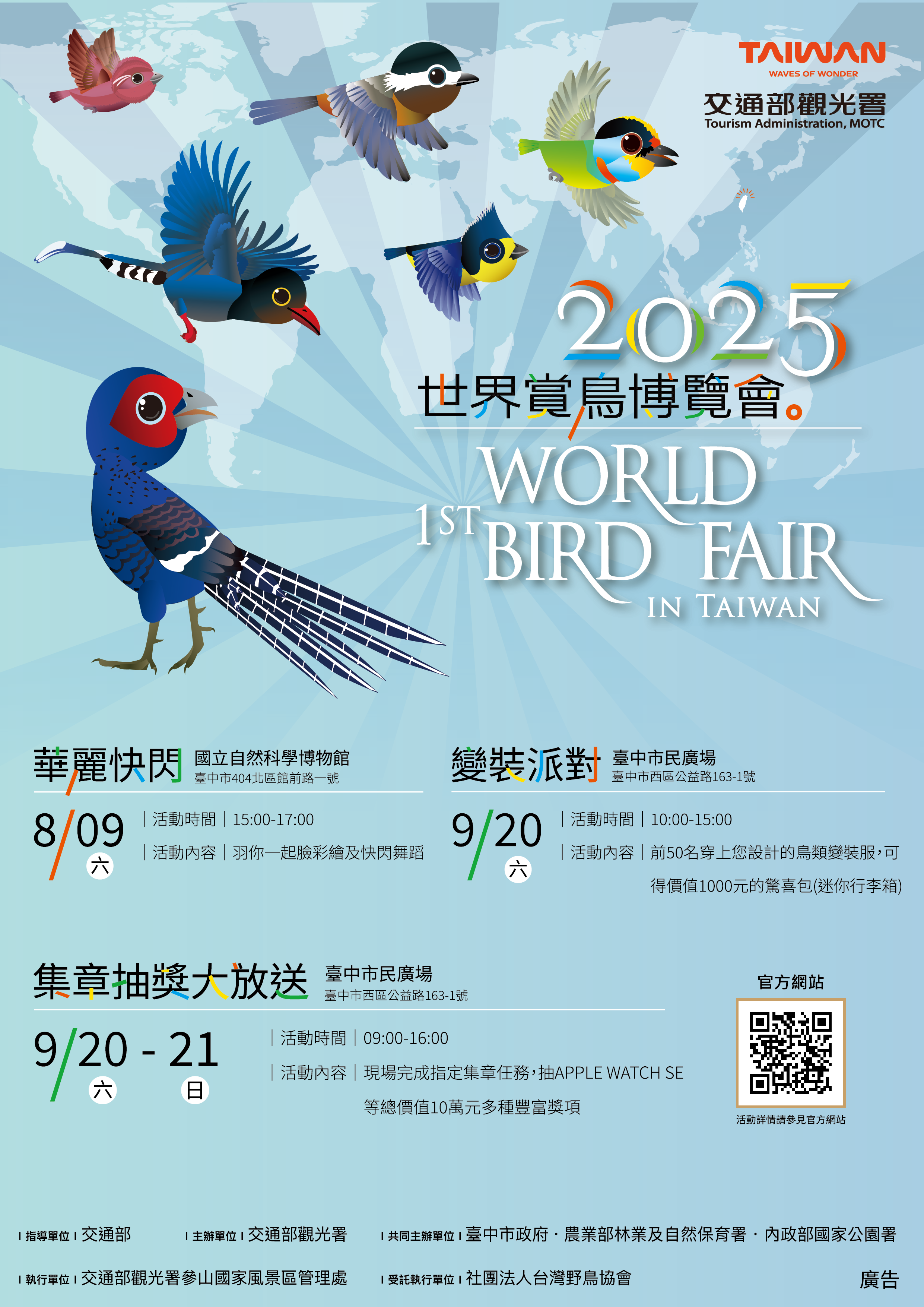 農業部林業及自然保育署、交通部觀光署、內政部國家公園署以及臺中市政府等單位合作舉辦的「2025年世界賞鳥博覽會」將於9月20日至21日在臺中市民廣場熱烈登場,活動邀請了30個國家將近百位的鳥友來臺,展開國際性的鳥類保育經驗交流,9月22日更安排百餘位鳥友前往大雪山國家森林遊樂區親身體驗賞鳥樂趣。林業保育署臺中分署也將在活動展攤中推出首次亮相的32種特有種鳥類徽章,向國際展現臺灣的鳥類生物多樣性。 林業保育署臺中分署表示,位於臺中地區的大雪山國家森林遊樂區,是國內外知名的賞鳥熱點,從東勢林業文化園區出發長達50公里的大雪山林道,除了記錄了多達231種鳥種,還可以看到32種特有鳥種中的31種,該分署在2025年舉辦的第15屆「大雪山賞鳥大賽」中,更首次由參賽鳥友們齊力達成24小時內觀察到31種臺灣特有鳥種的創舉。本次活動中臺中分署特別推出的「臺灣32種特有種鳥類精美徽章」,是愛好賞鳥遊客們的心聲,透過徽章保存及收藏健行賞鳥途中的美好記憶,搭配專用布旗呈現鳥種出現的海拔排列,可以讓大家更了解這些只有在臺灣出現的臺灣之光,喜愛鳥類生態的朋友絕對不能錯過。 林業保育署張岱副署長在今日「2025年世界賞鳥博覽會」開幕活動致詞中指出,臺灣位於東亞-澳洲的候鳥遷徙路線上,又有多樣的棲地環境,雖然面積只佔全球陸域的0.025%,依據2023年中華民國野鳥學會出版的臺灣鳥類名錄記錄達686種鳥種,將近全球總鳥種數的6%,展現了高度的生物多樣性。林業保育署也持續與各界努力,推動瀕危鳥種復育、鳥類棲地保育、友善農作,保育成效已逐步展現,而林業保育署臺中分署連續15年辦理的「大雪山賞鳥大賽」,也是呼應「昆明-蒙特婁全球生物多樣性框架」第21項「全民參與」、「在地知識整合」與「公民科學」精神,推動公民科學參與的具體實踐場所。 林業保育署臺中分署表示,除了來自世界各地的賞鳥及鳥類保育的從業人員與專家,透過「生態旅遊與永續觀光國際論壇」分享各國獨具特色的賞鳥活動及鳥類保育的經驗,活動中也聚集了全臺推動鳥類保育的機關學校、推廣賞鳥活動的鳥會及團體、辦理賞鳥遊程以及販售周邊產品的業者,將近120個展攤一起交流。 林業保育署臺中分署也帶來與comoor聯名新推出「可愛特有種鳥類刺繡吊牌」、黑長尾雉&藍腹鷴T繡、可愛的鵂鶹登山襪、黃山雀玩偶、大雪山「有稚一同」及「小雀幸」拼圖、有著大冠鷲、紅頭山雀的精美隨身傘與保溫瓶等,系列「山林製造」推出的特色鳥類商品,邀請有興趣的民眾9月20日至21日來到臺中市民廣場「2025世界賞鳥博覽會」,也可以到活動官網以及林業保育署臺中分署官網及粉絲專頁追蹤最新資訊!