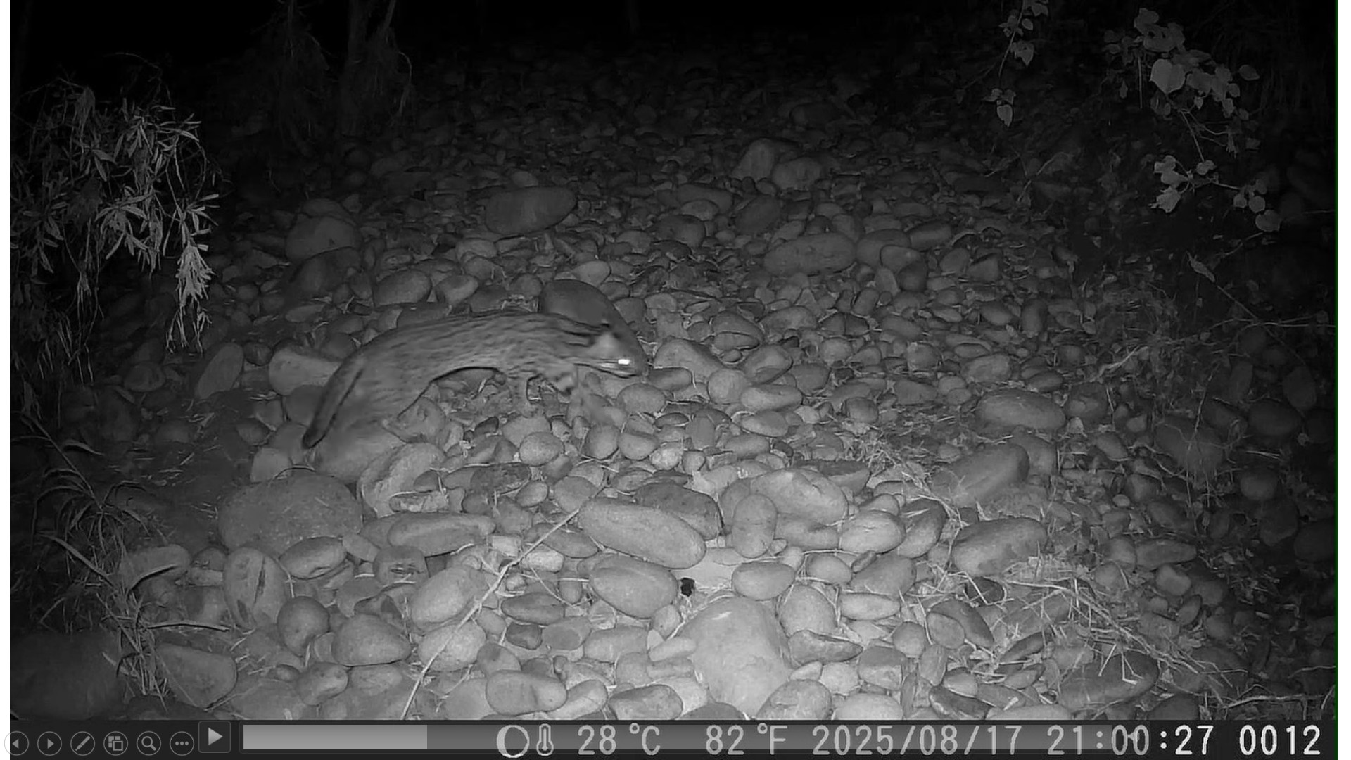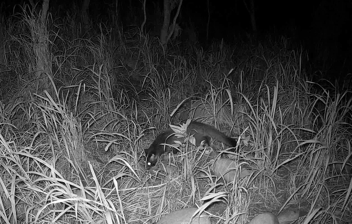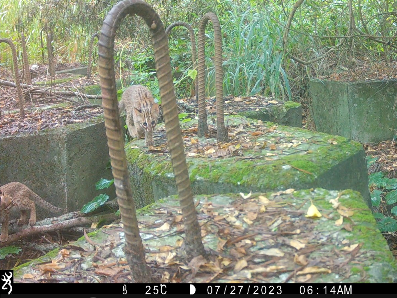 睽違二十年,石虎於今(114)年8月,在林業及自然保育署臺中分署設置於鹿寮南溪的自動相機捕捉到身影,這項珍貴的紀錄,象徵該溪流生態治理及復育的顯著成效,成功讓曾因災害而土砂裸露的河床,蛻變為生機勃勃的生態廊道,為石虎擴展棲息地帶來希望,也為未來的保育行動注入強心劑。 位於臺中市沙鹿區的鹿寮南溪,座落於國土綠網中大肚臺地淺山保育軸帶,關注物種有石虎、穿山甲、環頸雉等保育類動物,是林業保育署臺中分署積極推動的保育區域;然而從102年衛星影像中觀察,鹿寮南溪河床曾為大片裸露的黃褐色卵礫石堆積。為了抑制土石下移與強化溪流穩定,該分署於111年起,運用現地卵石,以多孔隙卵石固床工與生態護岸等治理工程,歷經4年的努力,近期除可清楚看到溪流兩側綠意盎然,現地調查濱溪地帶也逐漸恢復原生植被,生態系正逐步重建。 林業保育署臺中分署指出,114年8月間,設置於鹿寮南溪的自動相機驚喜拍攝到一隻健康石虎的身影,這不僅是當地二十年來首度記錄到石虎再現,也成為國土生態綠網串連淺山物種棲地的重要里程碑。除了石虎外,自動相機也同步記錄到白鼻心、赤腹松鼠與環頸雉等野生動物活動,顯示當地棲地環境已恢復,生態系功能逐步健全,展現出復育工作的成效。 林業保育署臺中分署強調,依據臺中地區長期監測資料顯示,石虎族群於大安溪、大甲溪沿線已有穩定分布,112年即於大甲溪左岸近國道三號交流道,連接大肚臺地淺山保育軸帶北側處記錄到亞成體石虎出沒,這次發現石虎在北大肚臺地重現,是對復育工作的最佳肯定,也為石虎族群在大肚山南北棲地連接展現曙光,未來將持續推動棲地改善、生態廊道串聯等措施,加強區域內藍綠帶連結,積極營造更友善的自然棲地,讓更多野生動物得以穩定繁衍,朝人與自然和諧共處的目標邁進。