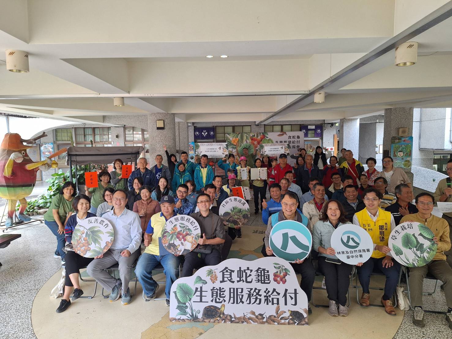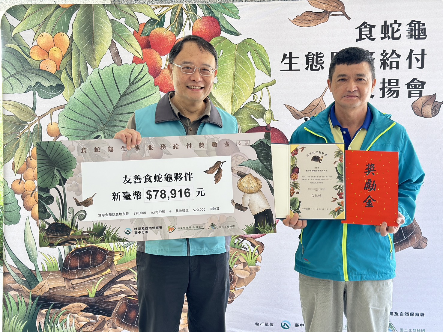 林業及自然保育署臺中分署今(13)日在霧峰區桐林國小舉辦114年度「食蛇龜生態服務給付表揚會」,頒發感謝狀與近120萬元獎勵金,感謝投入食蛇龜保育的農民與社區夥伴。臺中地區自113年啟動「食蛇龜生態服務給付示範計畫」以來,反應熱烈,今年新增7位農友與1個社區參與,友善農地由17公頃擴增至28公頃,社區巡守面積由13公頃增加為36公頃,共有26位農友與2個社區巡守隊共同守護瀕臨絕種的食蛇龜。臺中分署也將推出友善食蛇龜的桂圓糖磚,為大家的日常生活帶來兼具保育意義的甜蜜滋味。 臺中分署表示,今年計畫成果亮眼,26位農友中有24位通報發現食蛇龜,通報率超過九成,首次嘗試架設的自動相機也拍下許多珍貴畫面,太平區農友陸進通的農地不僅讓食蛇龜安心棲息,也意外記錄到石虎與穿山甲的身影;另一位農友簡進田談起兒時常見食蛇龜的回憶,感嘆「以前和現在數量真的差很多」,在了解食蛇龜面臨的威脅後,他和兒子簡啟倫決定一起加入生態服務給付的行列;父子倆連續兩年實踐友善耕作與棲地營造工作,今年都在自己的果園裡見到食蛇龜,且簡啟倫今年配合計畫架設自動相機,更拍攝到石虎來訪,兩人直說投入的心力終於看見回報!在其他計畫農友田區也記錄到大冠鷲、藍腹鷴、領角鴞、食蟹獴等保育類動物,顯示友善農地逐漸串連成安全的生態廊道,不僅守護食蛇龜,也讓更多野生動物受惠。 除了農友的投入,社區參與的力量同樣關鍵。霧峰桐林社區去年成立食蛇龜巡守隊後,持續巡查環境、移除犬貓餵食點並向居民宣導,今年已明顯發現餵食行為減少,保育觀念在地逐漸扎根。參與巡守的農友張政良開心的說,加入計畫後越來越喜歡食蛇龜,現在也會主動向鄰里宣傳保育與生態服務給付的理念。霧峰萬豐社區今年首度加入巡守行列,並將海蟾蜍、綠鬣蜥等外來種納入監測通報,讓淺山地區的生態管理更全面,社區保育網絡也更完整。 臺中分署說明,食蛇龜主要棲息於淺山低海拔闊葉林與農地,但因開發干擾、棲地破碎化與非法捕捉,野外族群面臨高度威脅。經評估霧峰、太平地區果園具備適宜的環境條件,因此自去年起透過計畫輔導農民實踐不施用除草劑、減少農藥、不用毒鼠藥與刀片型除草機等友善措施,同時協助農友以保留落葉枯枝、維持草相、營造淺水池與設置巢箱等方式,讓農地兼具生產與棲地功能,並以「生態薪水」概念依營造成果核發獎勵金。 為讓更多民眾認識食蛇龜與友善農產品,臺中分署今年也委託食品廠商研發,以農友親手烘焙的友善食蛇龜桂圓製成限量「桂圓銀耳黑糖磚」與「桂圓薑母黑糖磚」,熱水沖泡即可享受溫暖飲品。產品預計明年農曆春節前在大雪山、八仙山森林遊樂區以及營林所臺中出張所宿泊所上架銷售,讓遊客親近自然時,不僅能品嘗暖身又暖心的香甜風味,更可以消費行動支持保育。 臺中分署張弘毅分署長表示,保育成功的關鍵在於社會大眾的參與,農友以友善農法營造棲地、社區以巡守行動維護生態,一般民眾可以透過選購友善農產品響應。當農地、社區與大眾形成互相支持的力量,就能編織起一張穩固的「貴人保育網」,為食蛇龜與淺山生態創造更安全、永續的未來。