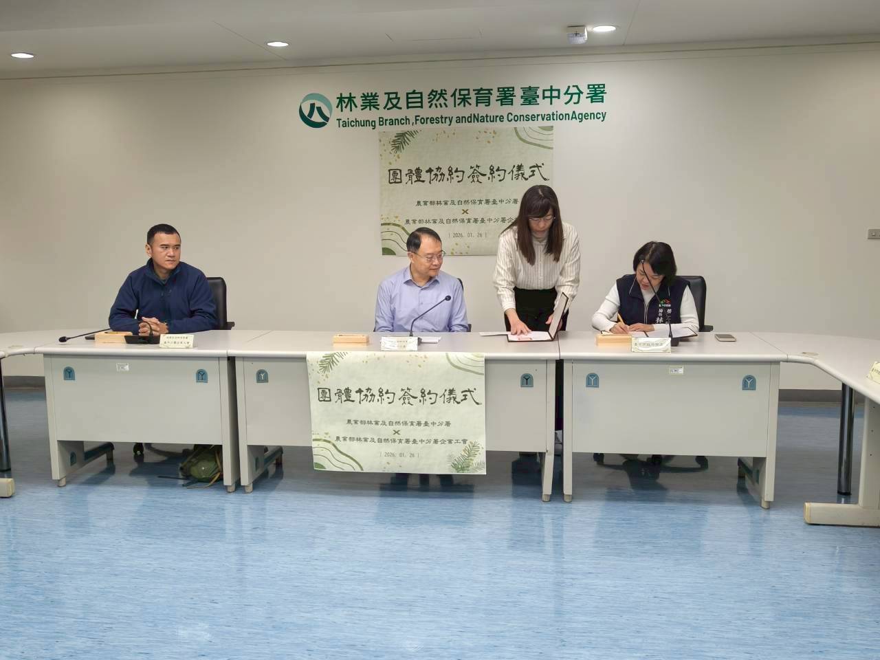 林業及自然保育署臺中分署與臺中分署企業工會於今(26)日上午,在臺中分署舉行團體協約簽約儀式,由分署長張弘毅與企業工會理事長劉玟廷代表簽署,並邀請臺中市政府代表勞工局局長林淑媛、臺灣省林業產業工會聯合會理事長陳志豪等貴賓蒞臨見證,勞資雙方在互信、理性協商的基礎上,正式建立穩定且具制度化的合作關係,為勞資和諧寫下重要里程碑。 林業保育署臺中分署張弘毅分署長表示,分署與工會長期以來都是緊密的合作夥伴關係,本次團體協約的完成,除了借鏡其他分署的實務經驗,更仰賴勞資雙方持續且充分的溝通,才能使協約內容更加周延與完善。本次簽約不僅是分署首次與工會簽訂團體協約,更是臺中地區中央公務機關首例,協約內容涵蓋勞動條件、工作權益與勞資溝通機制等面向,提供勞工更周全的保障,進一步穩定勞動關係,促進勞資和諧。 臺中市政府勞工局局長林淑媛表示,本次團體協約簽訂是勞資雙方兼顧機關運作和員工權益保障的前提下,在勞資雙方互信、互諒、理性協商所獲得的成果,協約中有關休假制度、健康檢查補助等內容,均優於現行的勞動法令,對公部門勞資關係具有正向示範作用。 林業工作多元且繁重,涵蓋林野巡視、自然保育、國土綠網建構及森林火災防救等各項任務,有賴第一線勞工同仁堅守崗位、辛勤付出,方能守護台灣珍貴的山林資源。臺中分署張弘毅分署長期許,透過團體協約的簽訂,能進一步促進勞工職家平衡,未來亦將持續依循勞動法規,打造友善、安心的工作環境。落實照顧員工的社會責任,奠定林業及自然保育永續經營奠定穩固基礎。