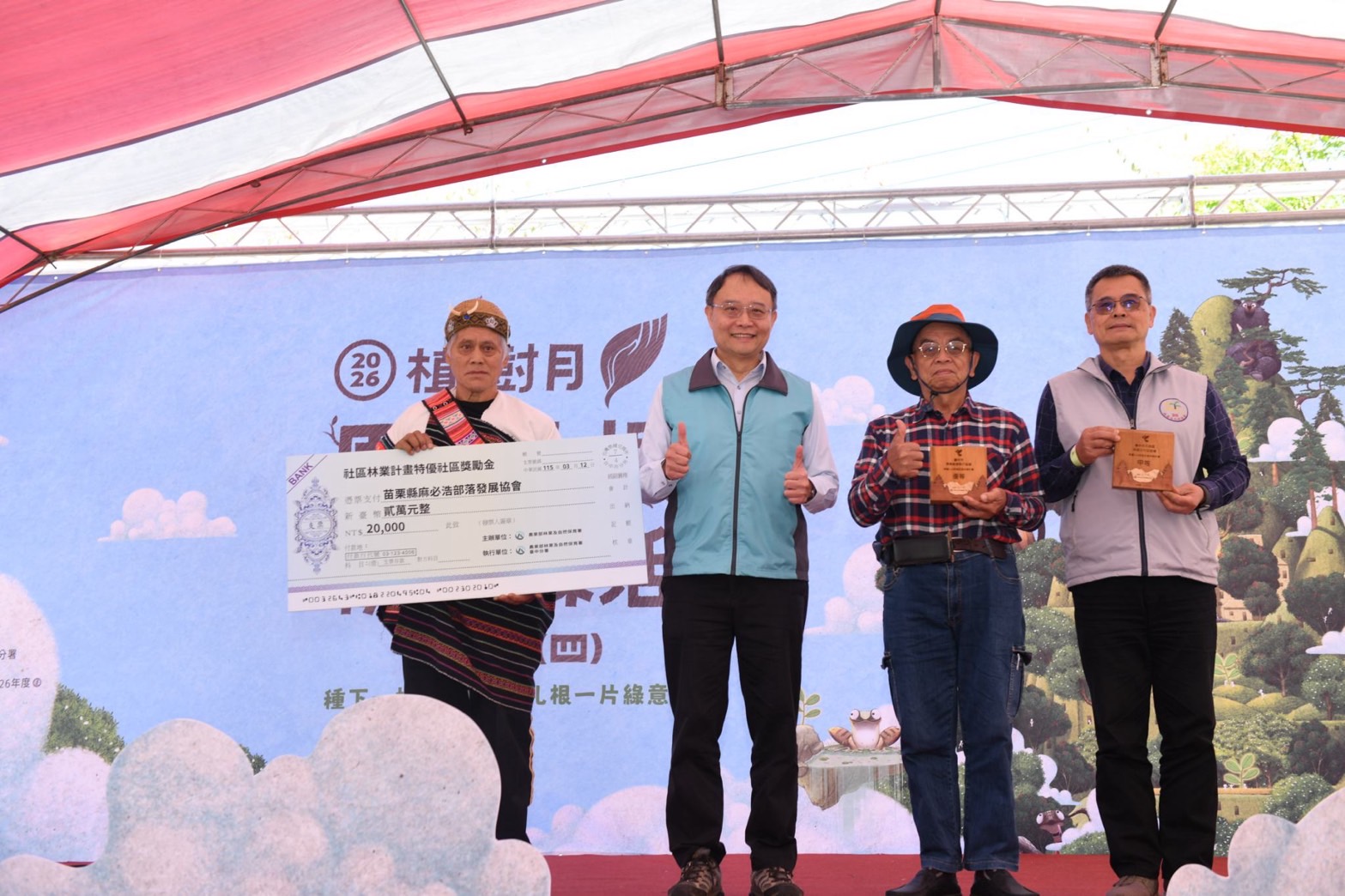 活動由臺中市翁子國民小學合唱團以童聲演唱揭開序幕,並邀請臺中市陶笛樂團協同林欣怡音樂創藝合奏《森林狂想曲》,以悠揚樂音為植樹行動展開序章。活動中,林業保育署臺中分署以扁柏製作國產材獎牌,頒發予企業認養造林夥伴,感謝第一商業銀行、台中商業銀行、萬海航運股份有限公司、中強光電股份有限公司及山木島有限公司等企業長期投入森林經營與環境永續,以實際行動支持造林與綠色治理。同時亦頒獎表揚114年執行社區林業計畫績優社區,包括臺中市東勢創意執行協會、苗栗縣麻必浩部落發展協會及臺中市石岡區南眉文化促進會等單位,表彰社區部落積極參與森林保育、生態教育與地方共好,使永續理念與發展逐步落實。